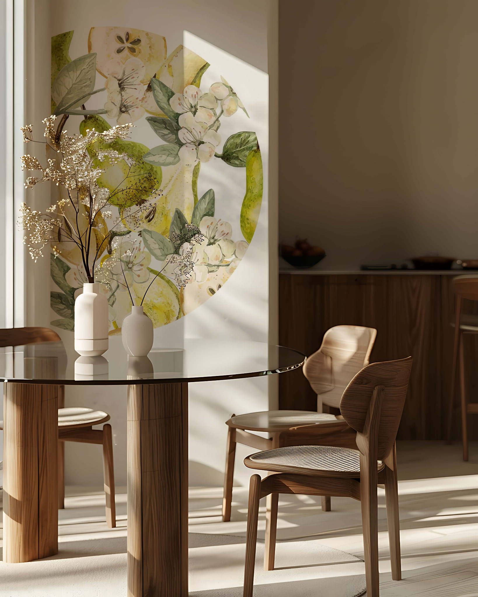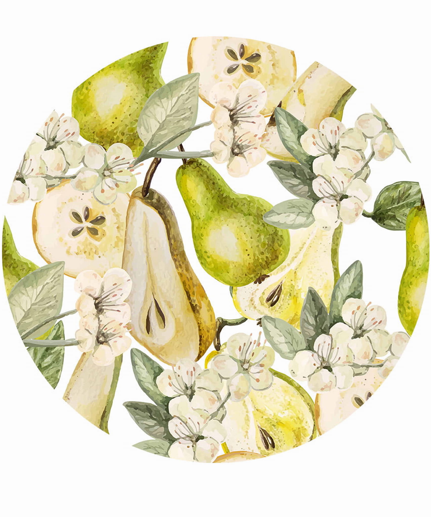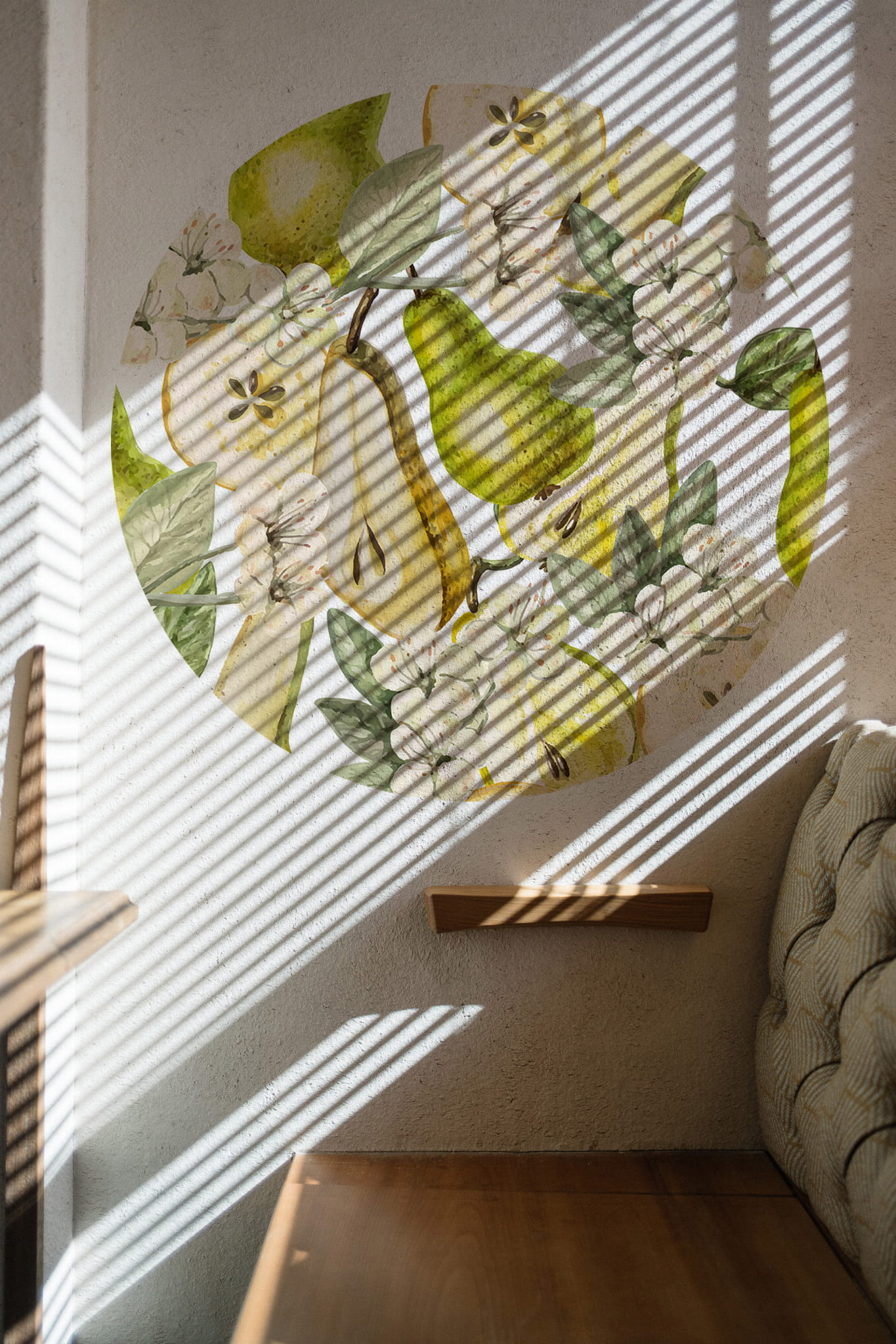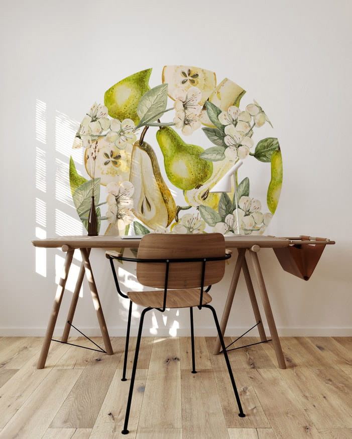 Delikatne owoce gruszy i kwiatów powiewających na wietrze wprowadzają subtelne ciepło i przytulność do wnętrz. Ta naklejka świetnie sprawdzi się w roli zagłówka.