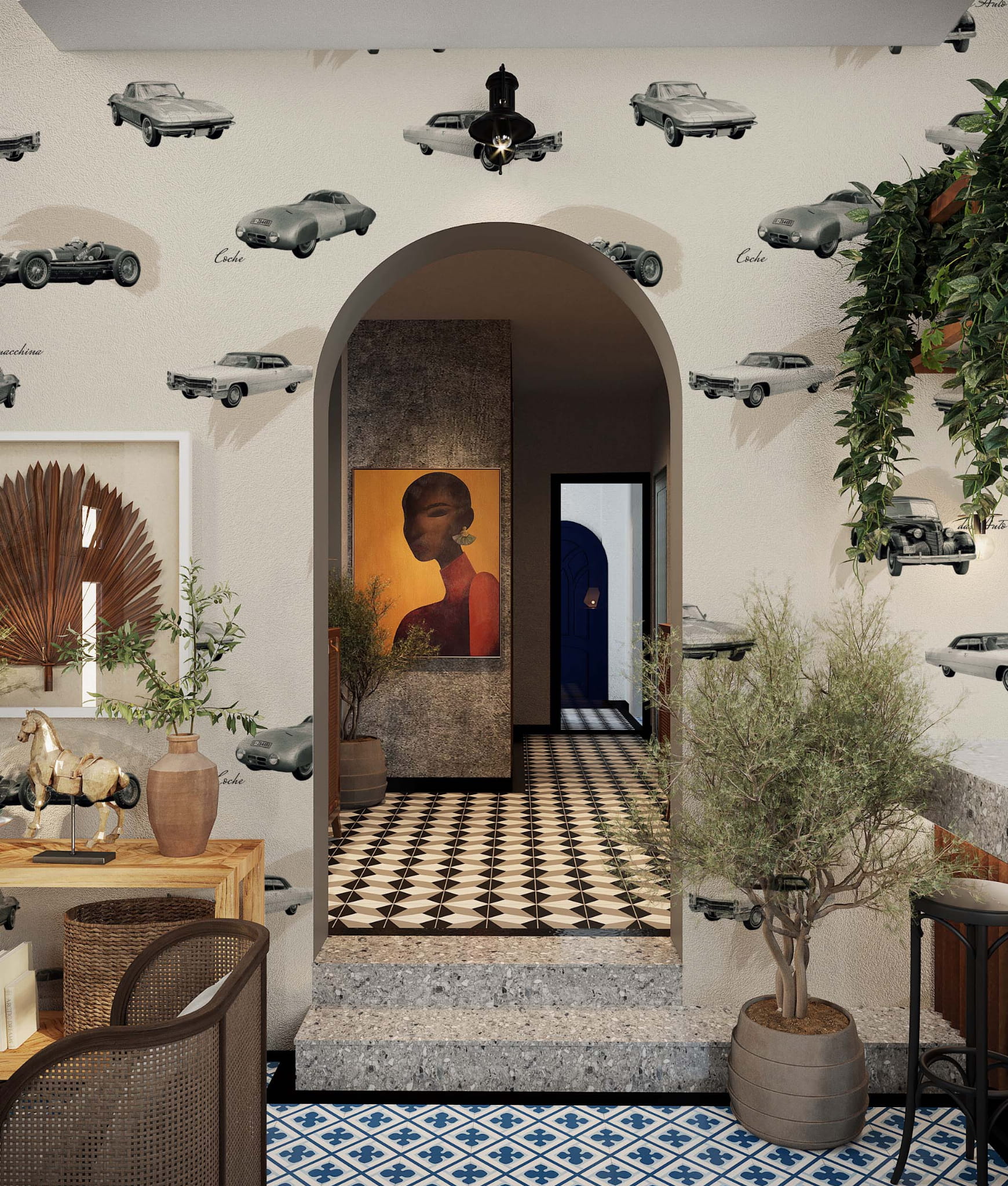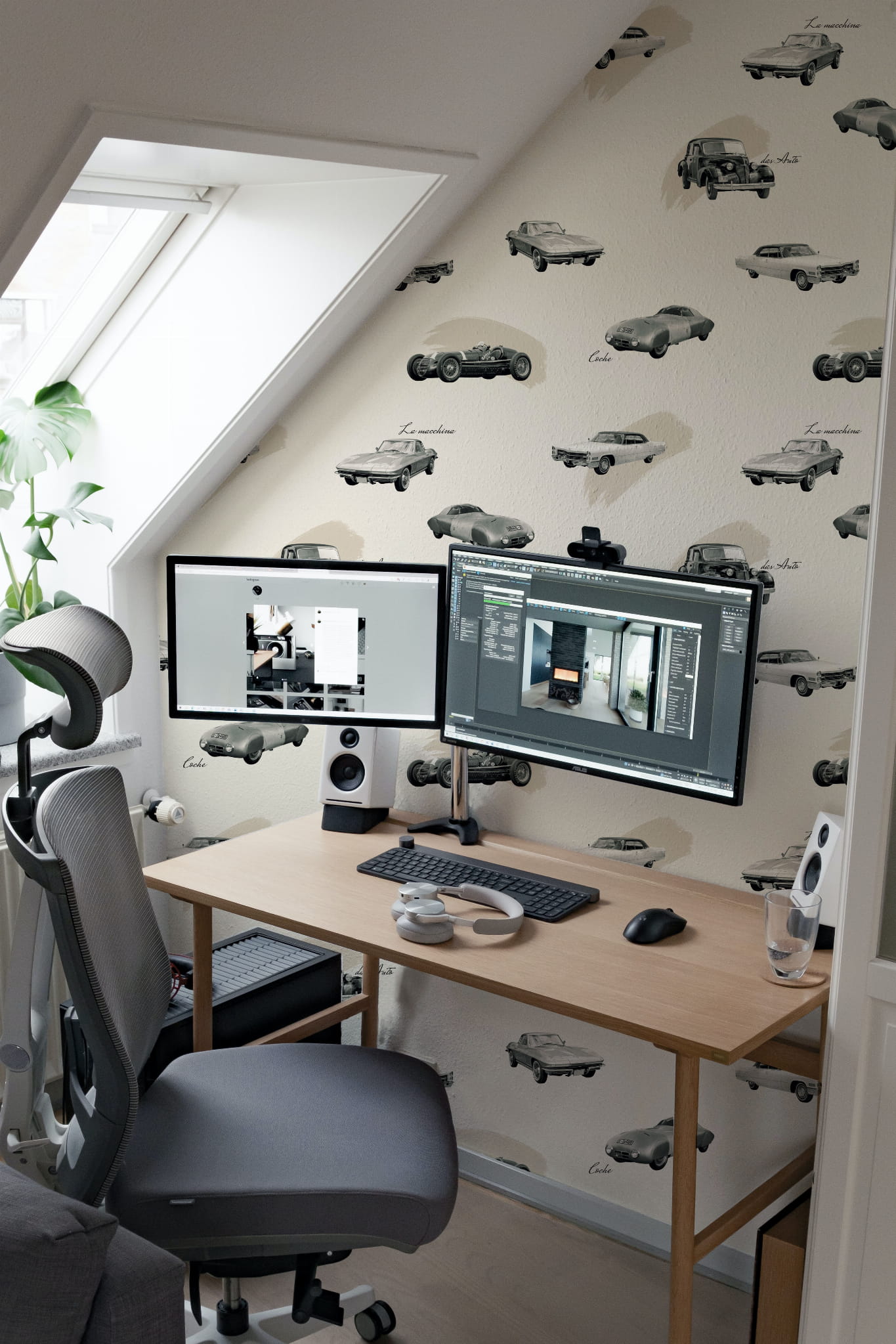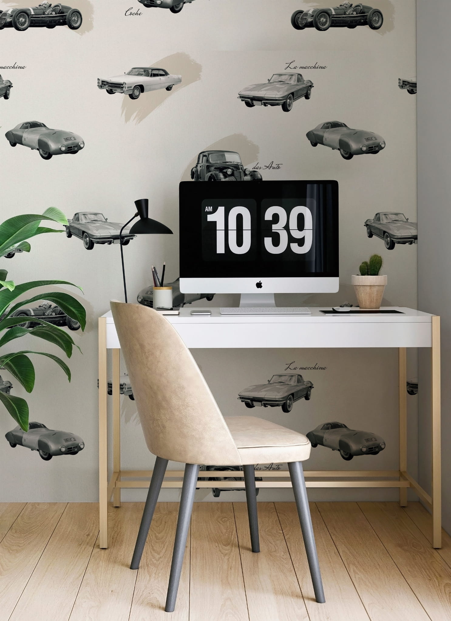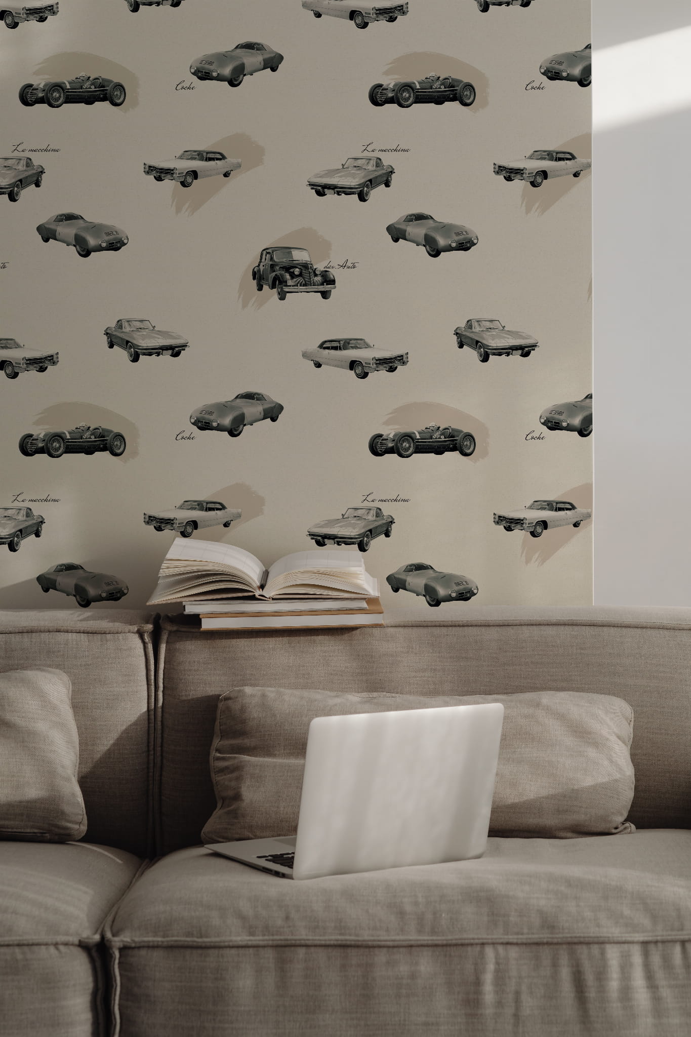 Idealna tapeta dla fanów motoryzacji, do biura, pokoju nastolatka czy sypialni. Odcienie beżu w połączeniu z samochodowym wzorem sprawdzi się jako akcent na niejednej ścianie.
