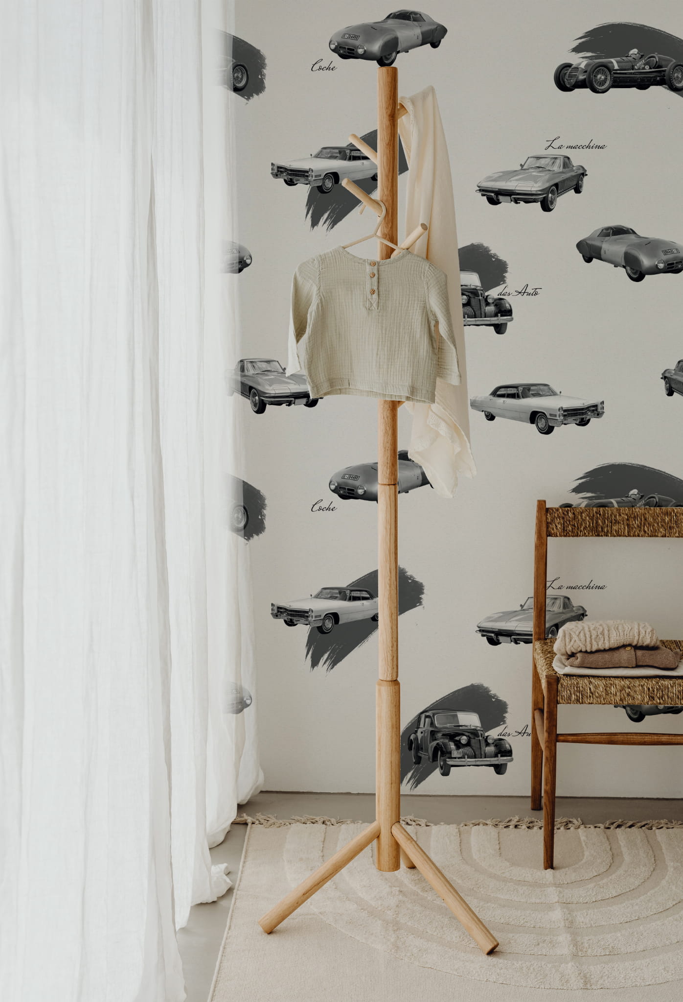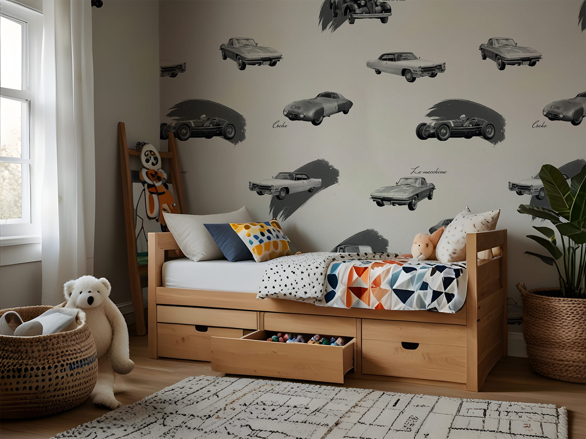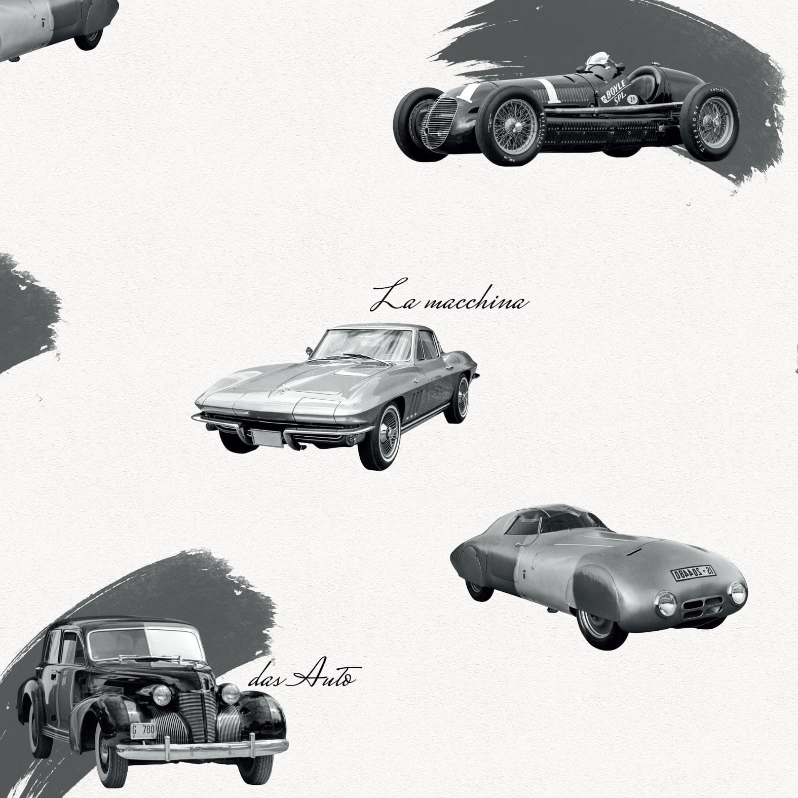 Idealna tapeta dla fanów motoryzacji, do biura, pokoju nastolatka czy sypialni. Odcienie szarości w połączeniu z samochodowym wzorem sprawdzą się jako akcent na niejednej ścianie.