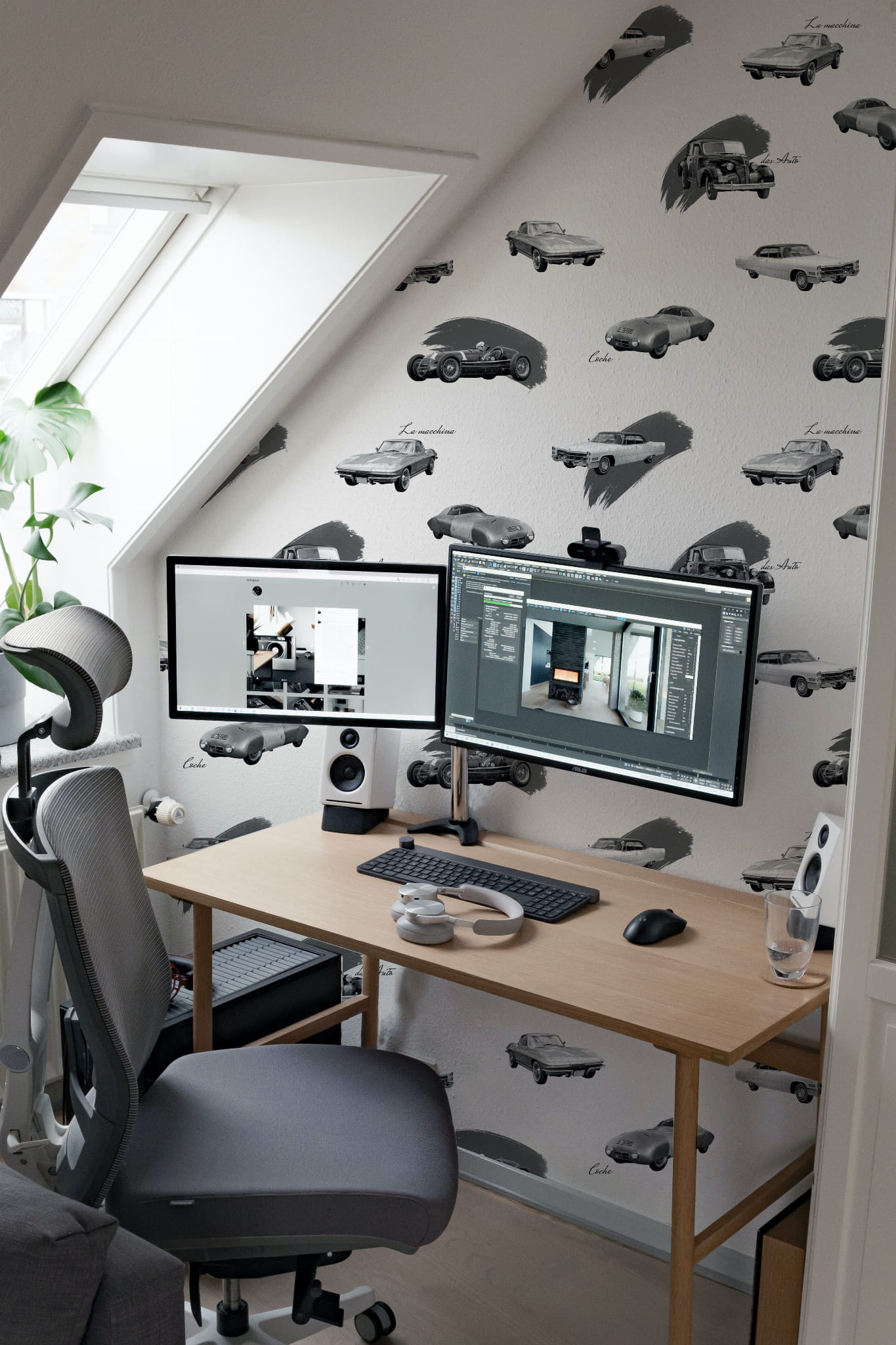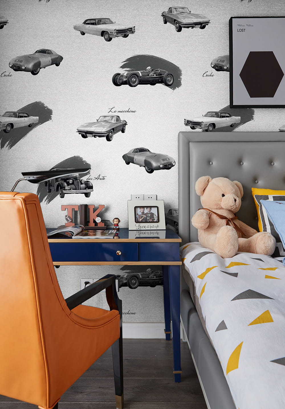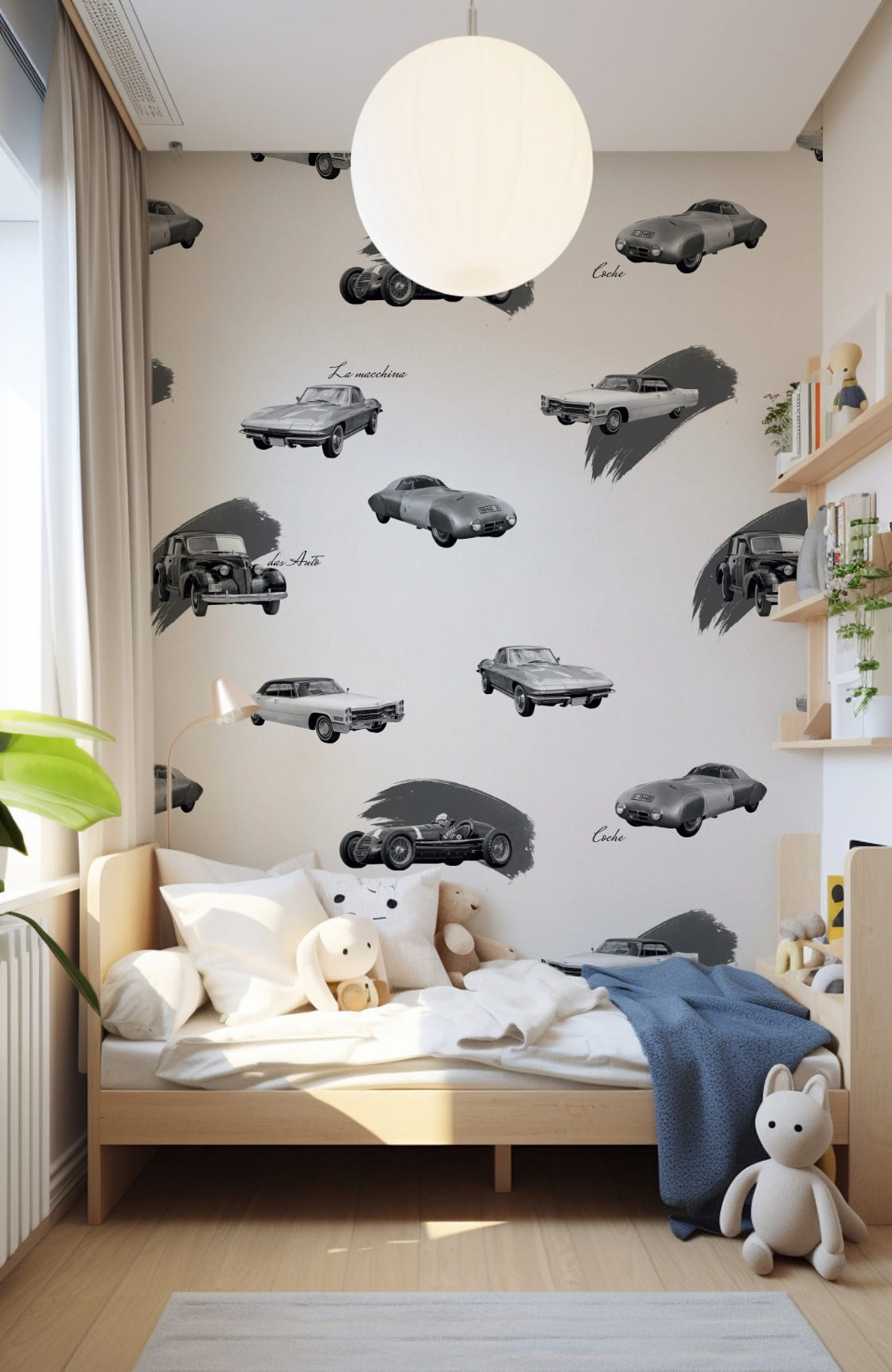 Idealna tapeta dla fanów motoryzacji, do biura, pokoju nastolatka czy sypialni. Odcienie szarości w połączeniu z samochodowym wzorem sprawdzą się jako akcent na niejednej ścianie.