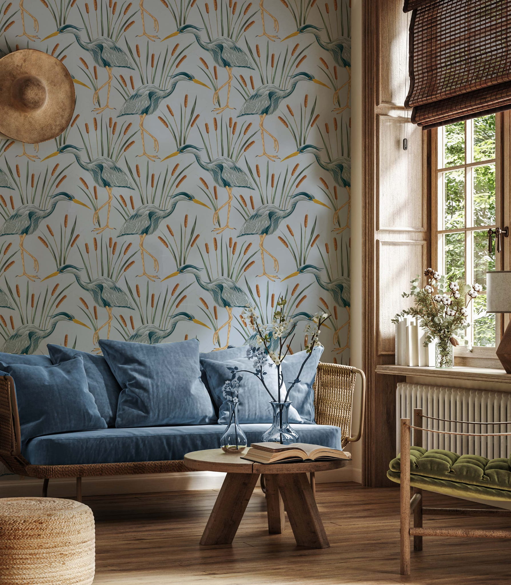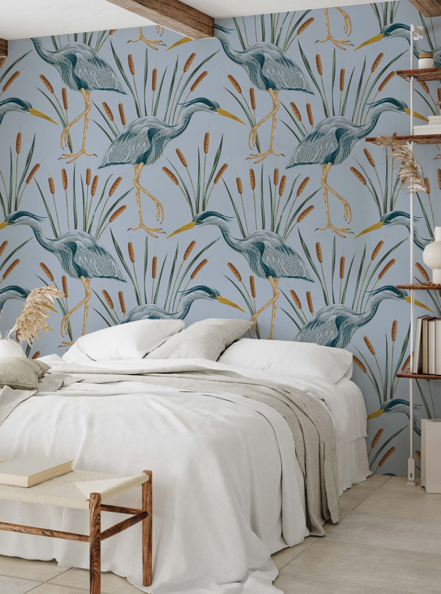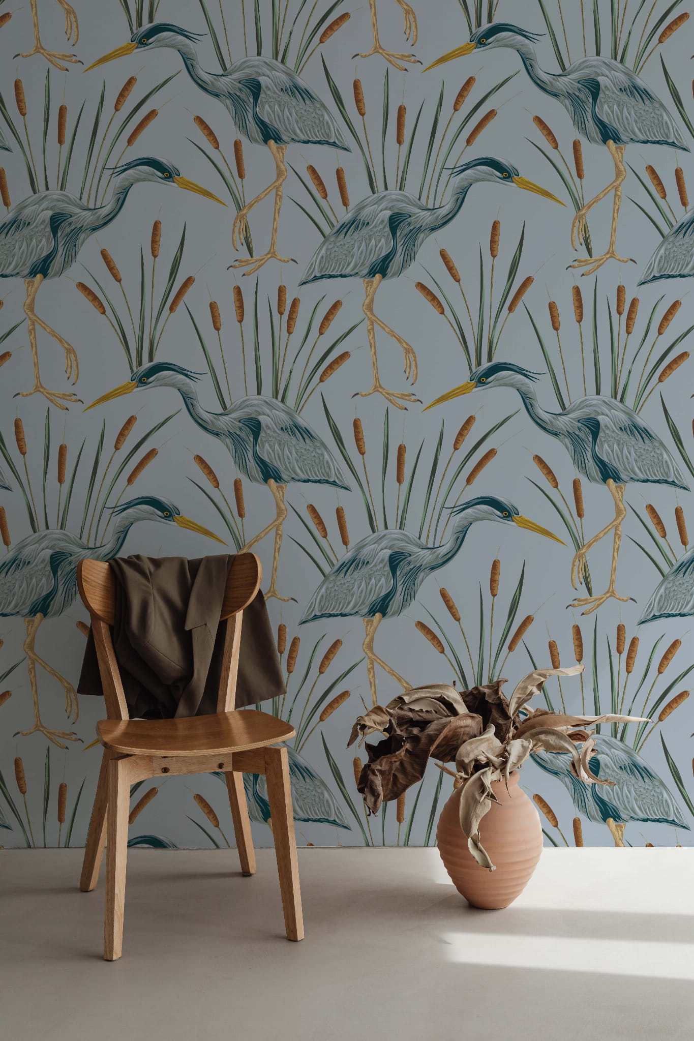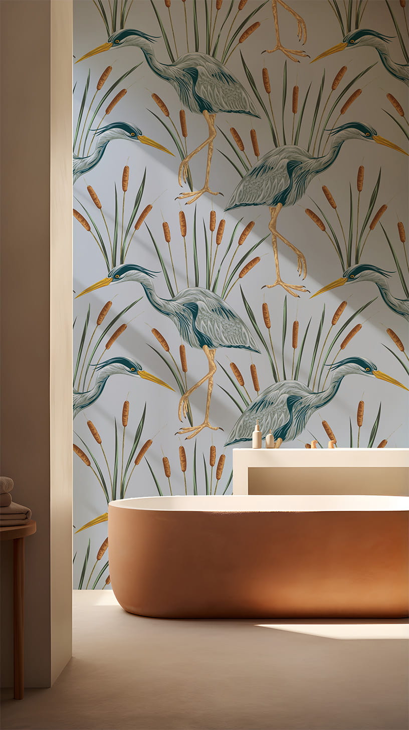 Eleganckie czaple oraz stonowane odcienie niebieskiego to gwarancja szyku w każdym pomieszczeniu. Ten wzór fantastycznie wkomponuje się w sypialni czy salonie i nada wnętrzu nowego życia na lata.