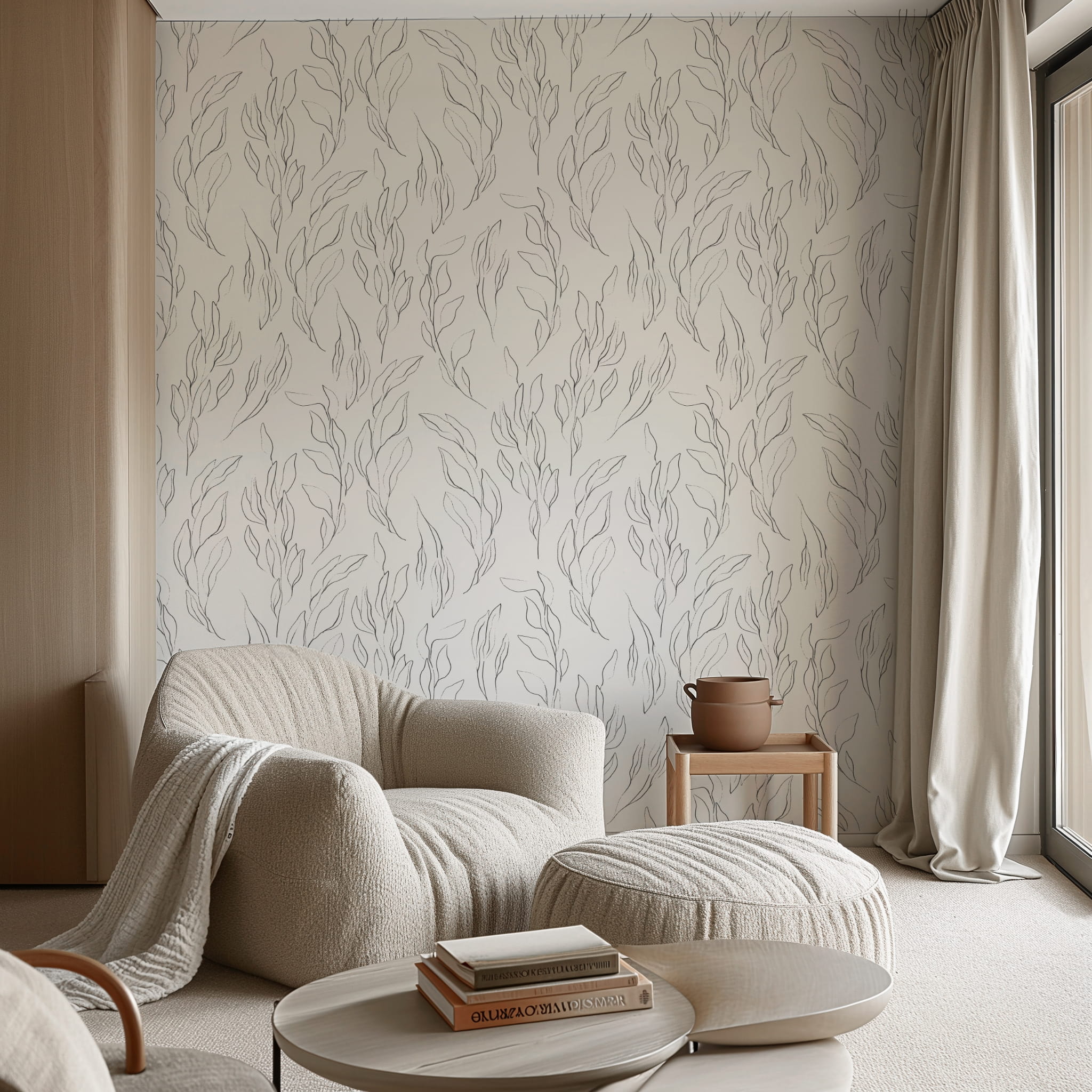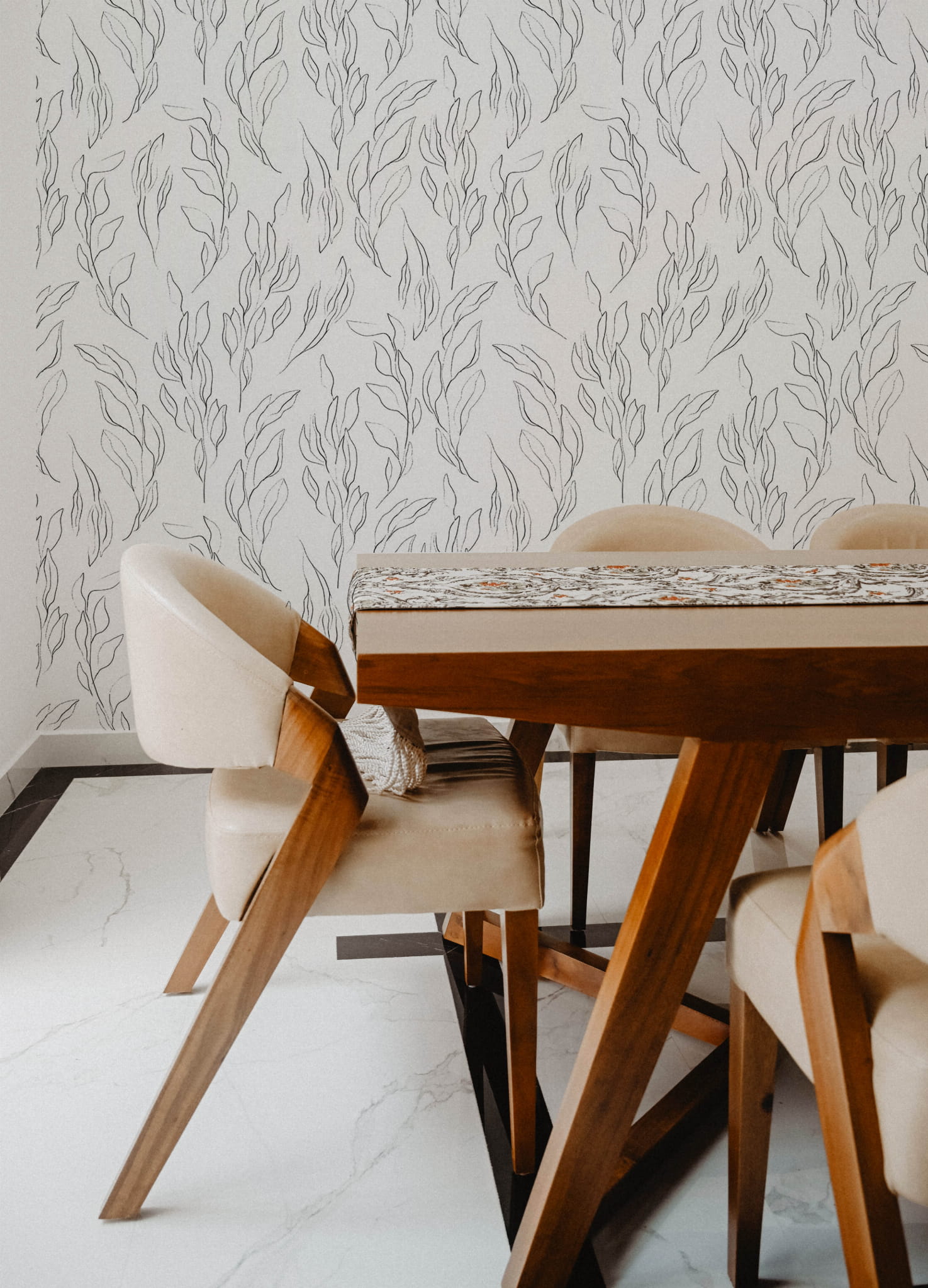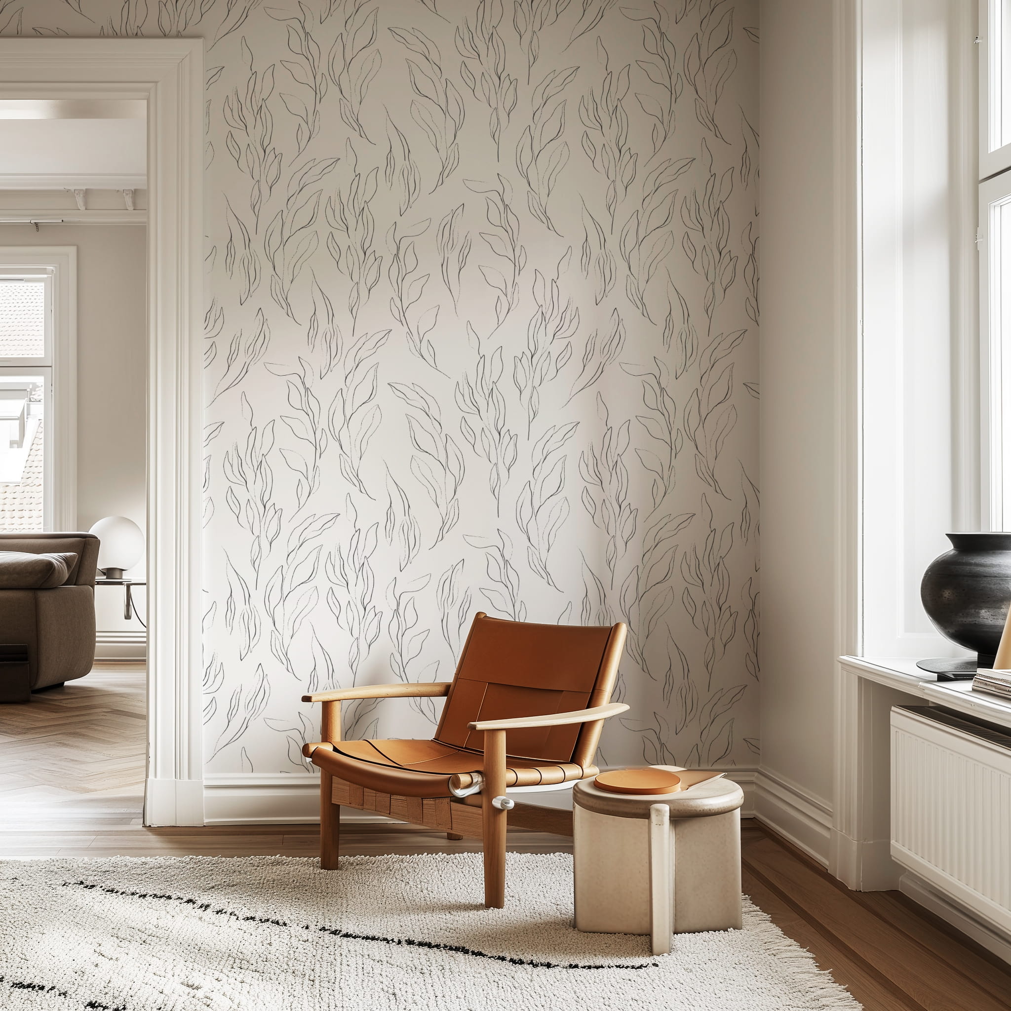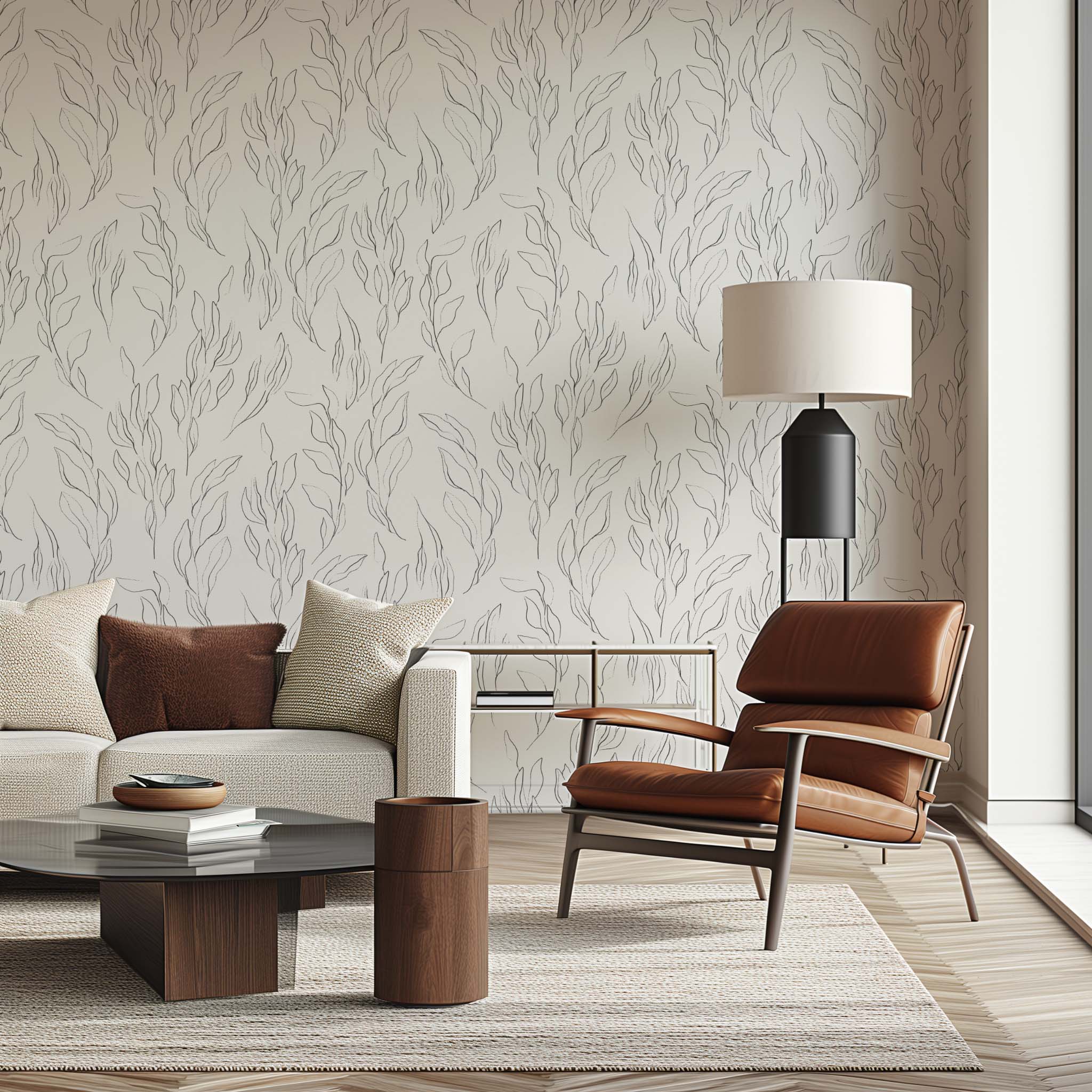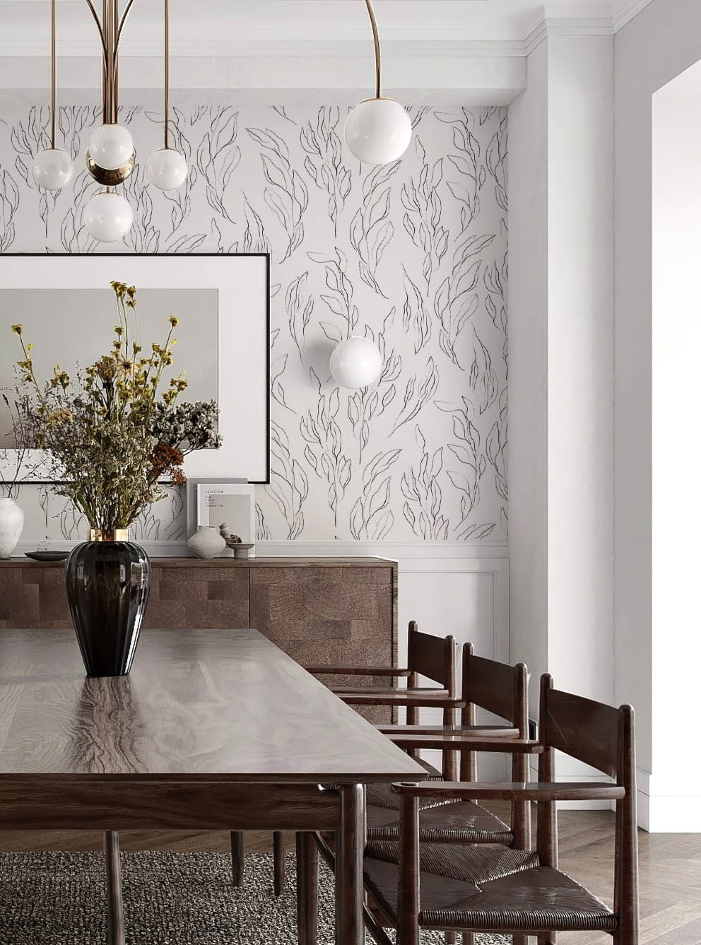 Tapeta przedstawiająca subtelną kompozycję delikatnych listków w czarnych konturach na białym tle. Jej minimalistyczny wzór dodaje pomieszczeniu wyrafinowanego uroku i lekkości. Ta tapeta idealnie pasuje do aranżacji wnętrz w różnym stylu, dodając im delikatnego, ale wyraźnego akcentu natury, co czyni ją doskonałym wyborem dla miłośników prostych, lecz eleganckich dekoracji.