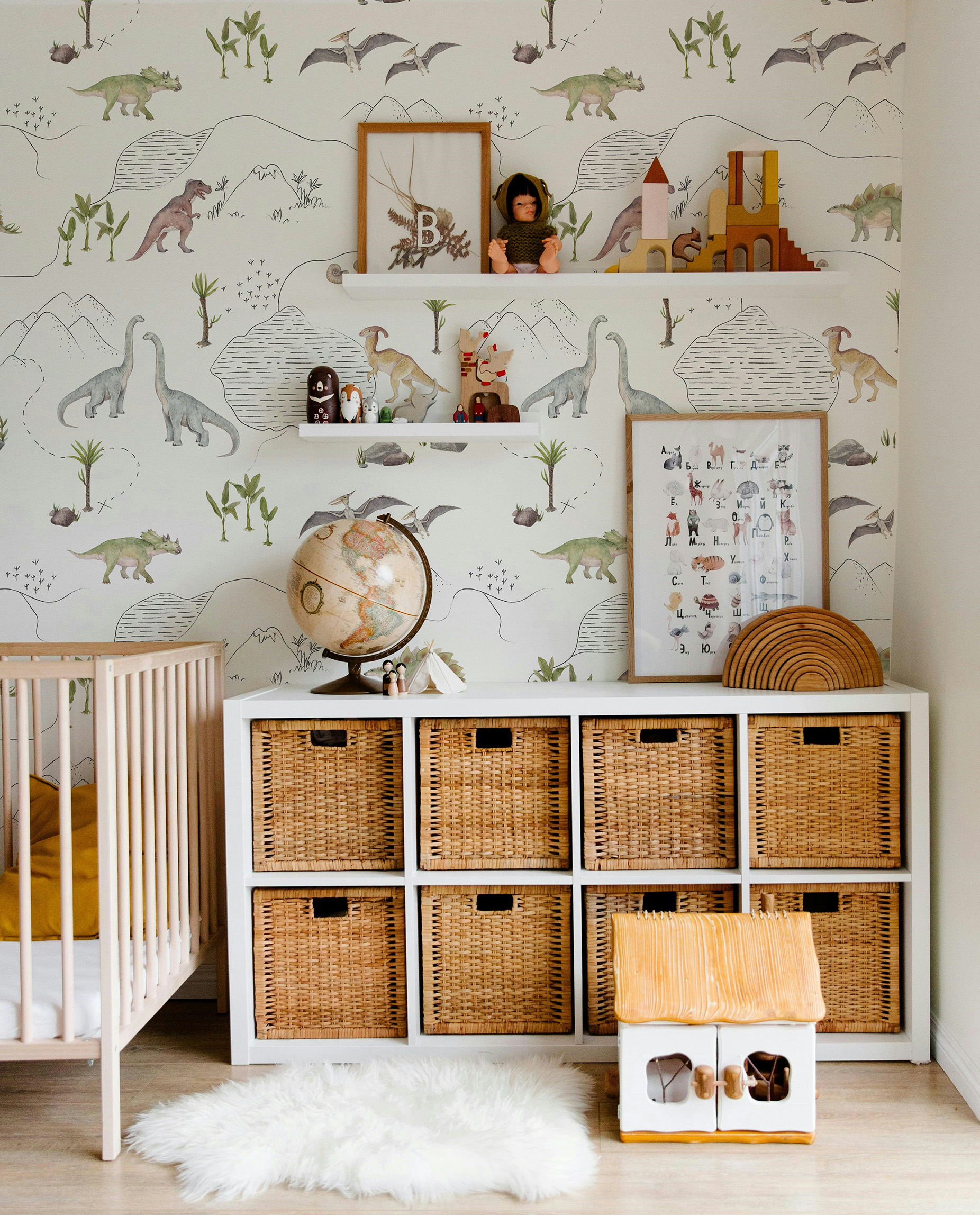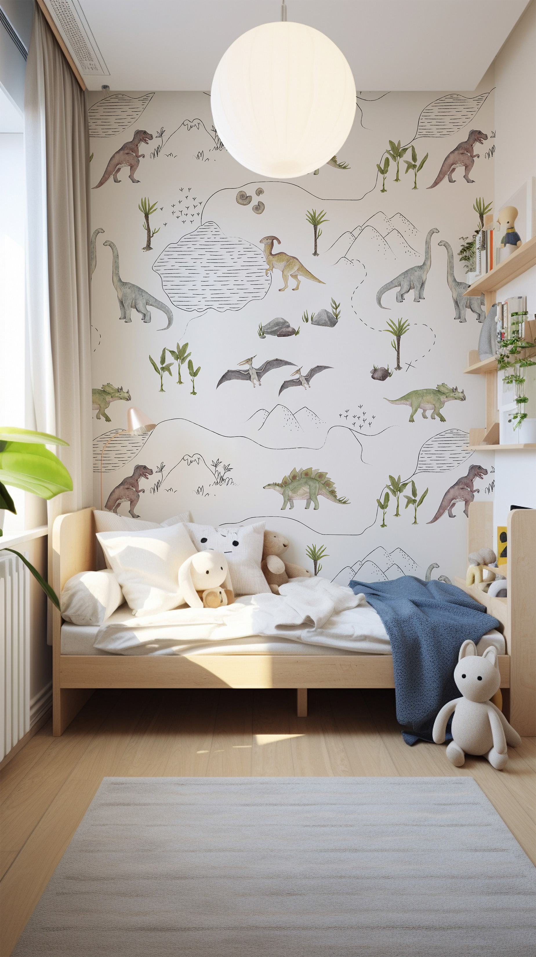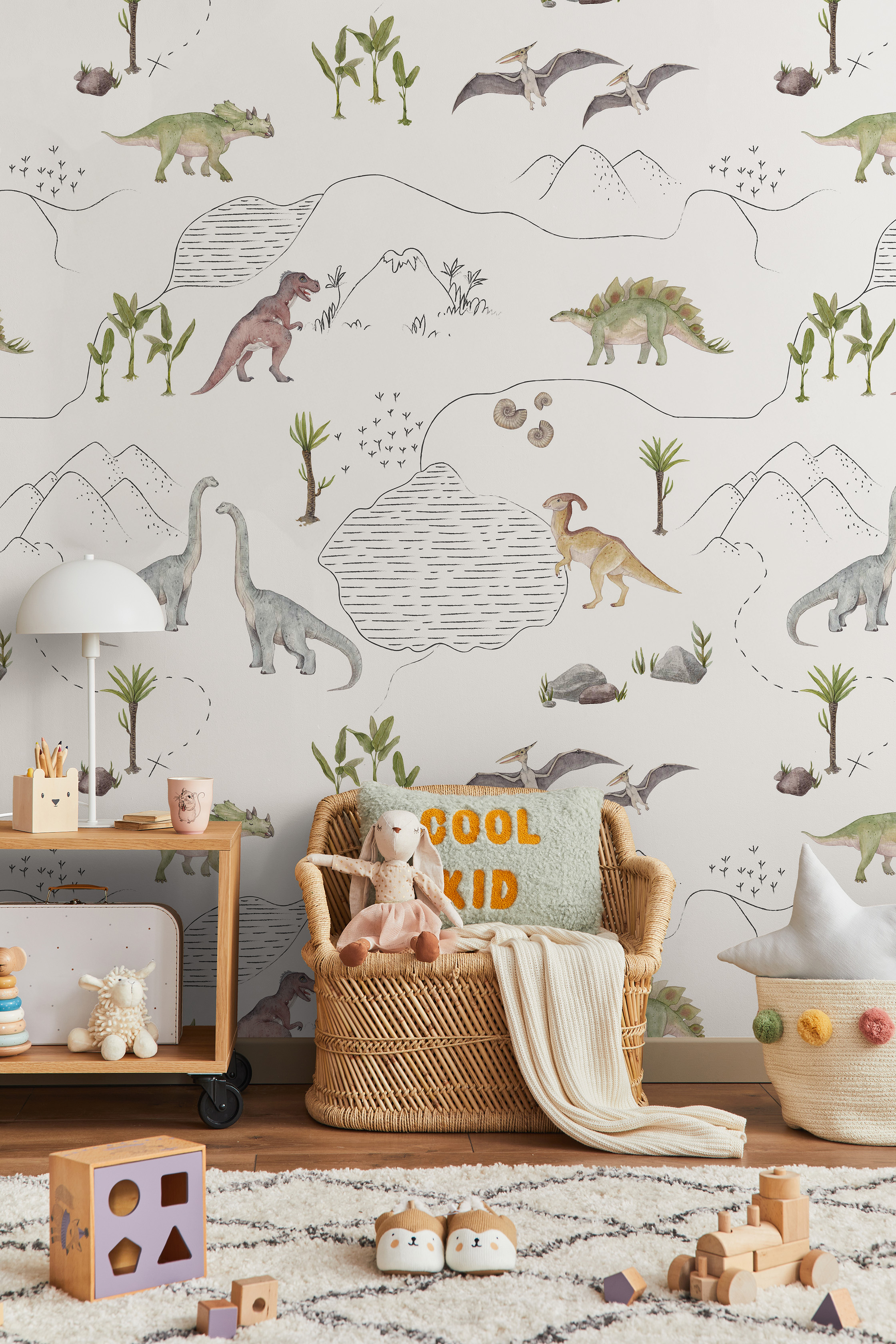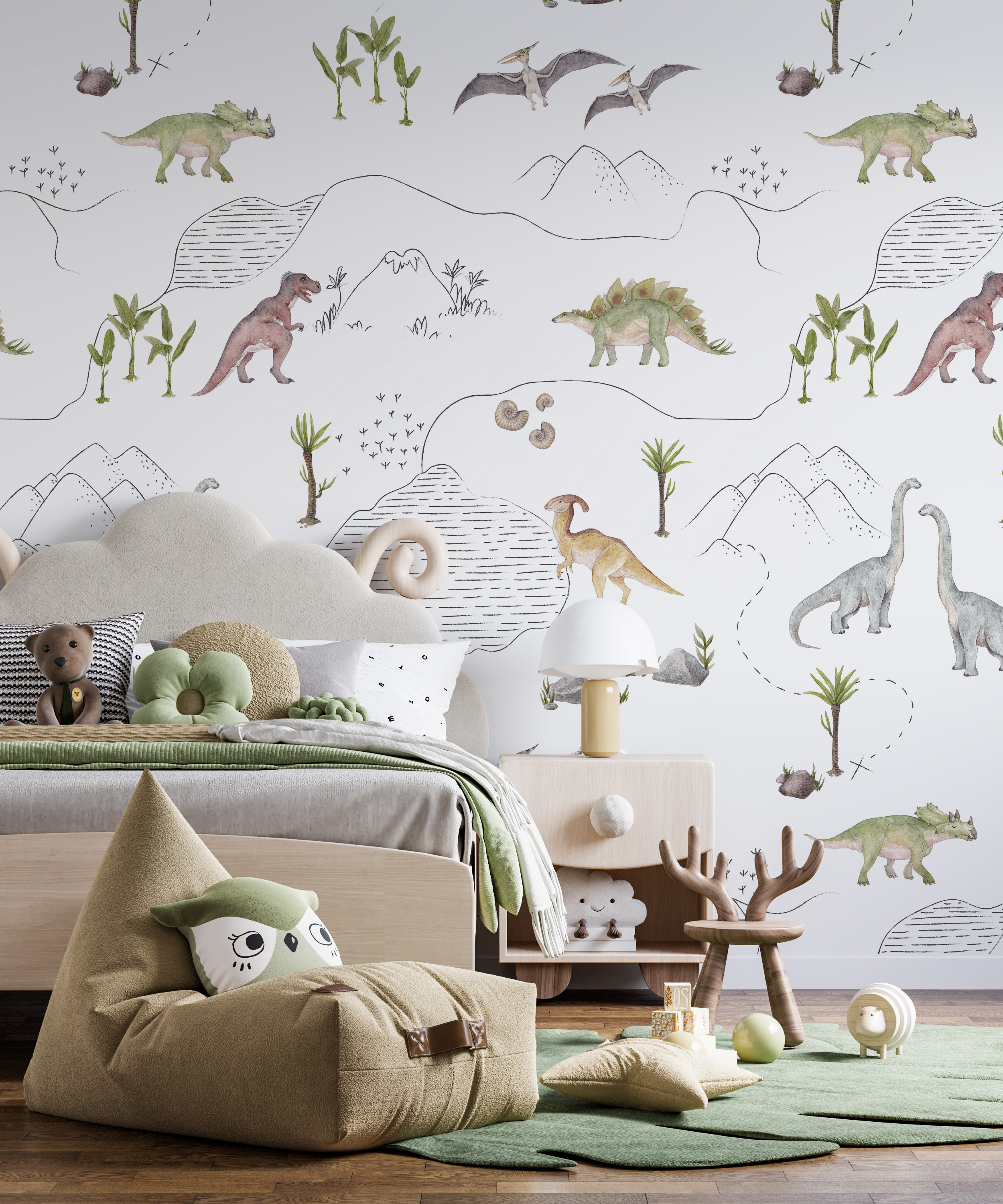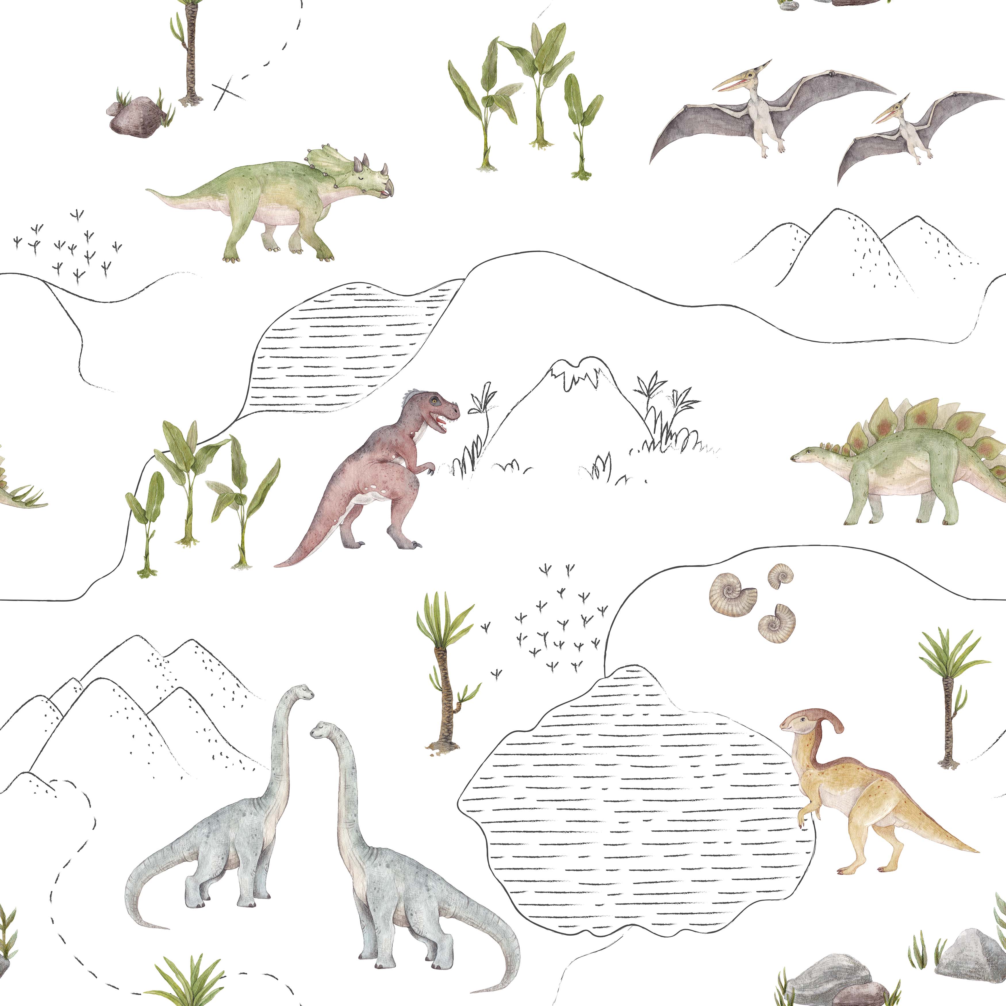 Minimalistyczne i monochromatyczne dinozaury stanowią neutralną odmianę naszego kultowego wzoru, przedstawiającego ich świat. Jest to doskonały wybór dla osób, które nie przepadają za intensywnymi kolorami we wnętrzach, lecz pragną wprowadzić do pokoju dziecka te wspaniałe stworzenia.