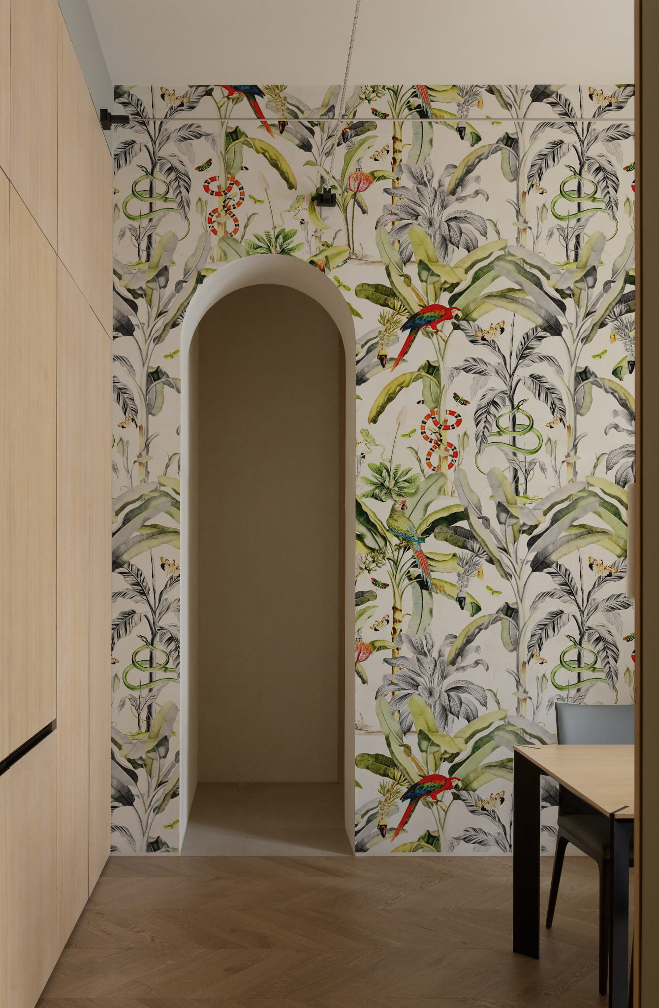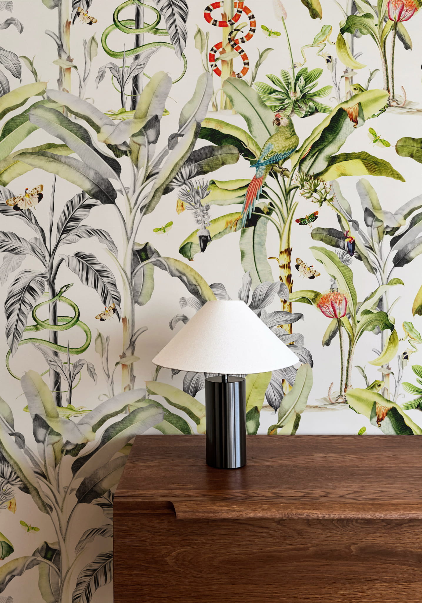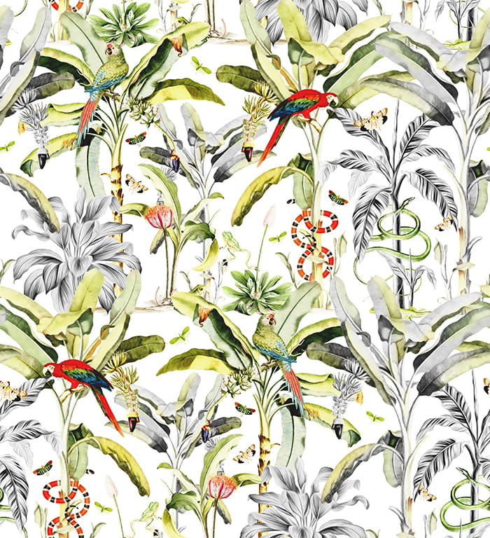 Tapeta przedstawiająca egzotyczne, występujące w dżunglach, liście roślin. Żywe zielenie ożywią wnętrze i nadadzą mu radosnego charakteru. Motyw liści na ścianie sprawi, że poczujesz się jak na tropikalnych i egzotycznych wakacjach i doskonale sprawdzi się u osób, które z jakiegoś powodu nie hodują roślin donniczkowych, a nadal chcą, aby ich wnętrze wypełniała ich zieleń i świeżość.