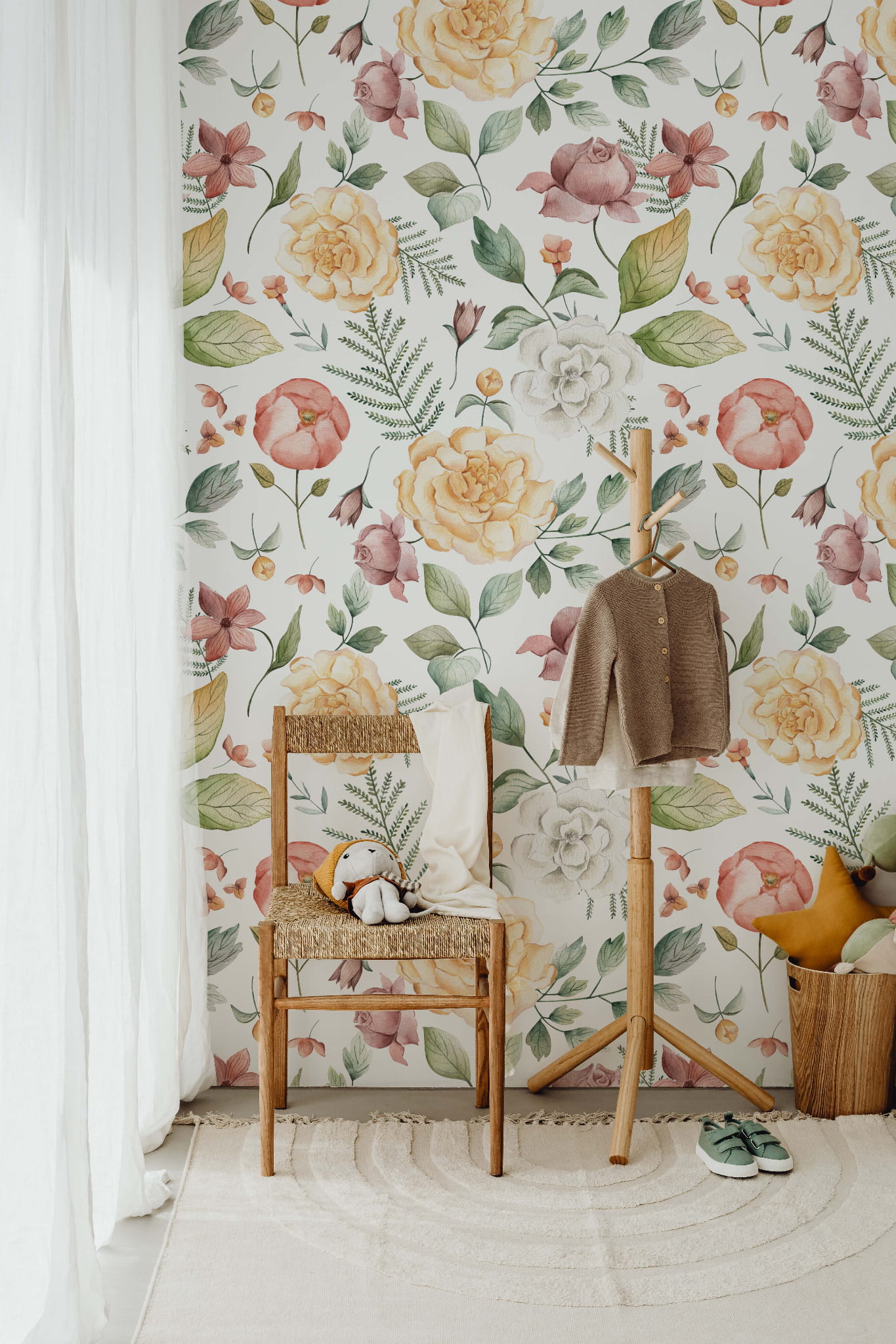Ta tapeta w kolorowe, letnie kwiaty dopasuje się do każdego wnętrza nadając mu niepowtarzalny charakter. Wzór kwiatów wprowadzi ciepło i energię. To idealne rozwiązanie, żeby pokoik dziecięcy stał się jeszcze bardziej pogodny.