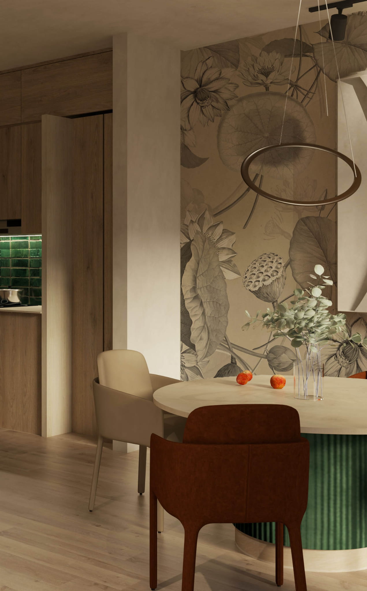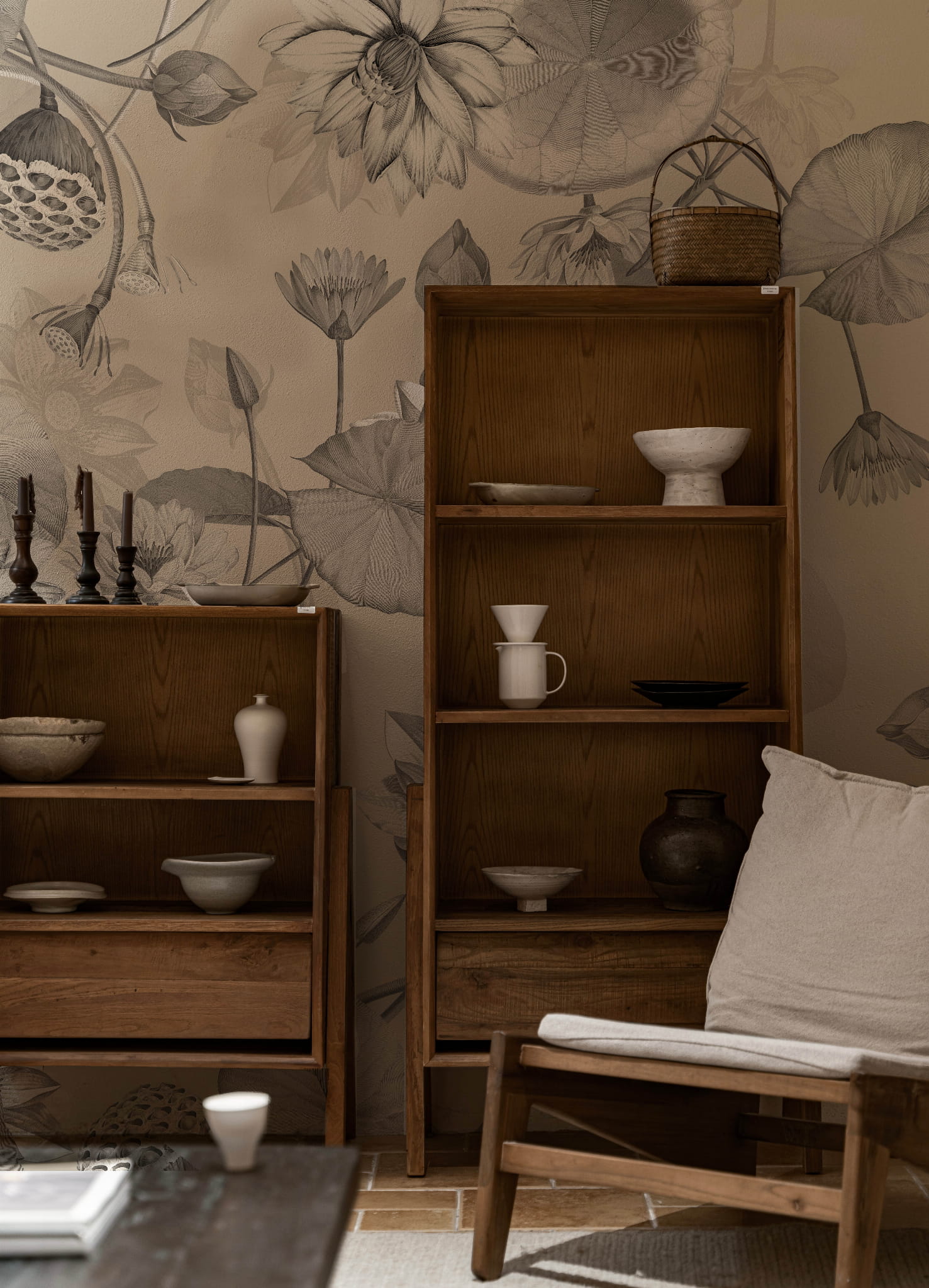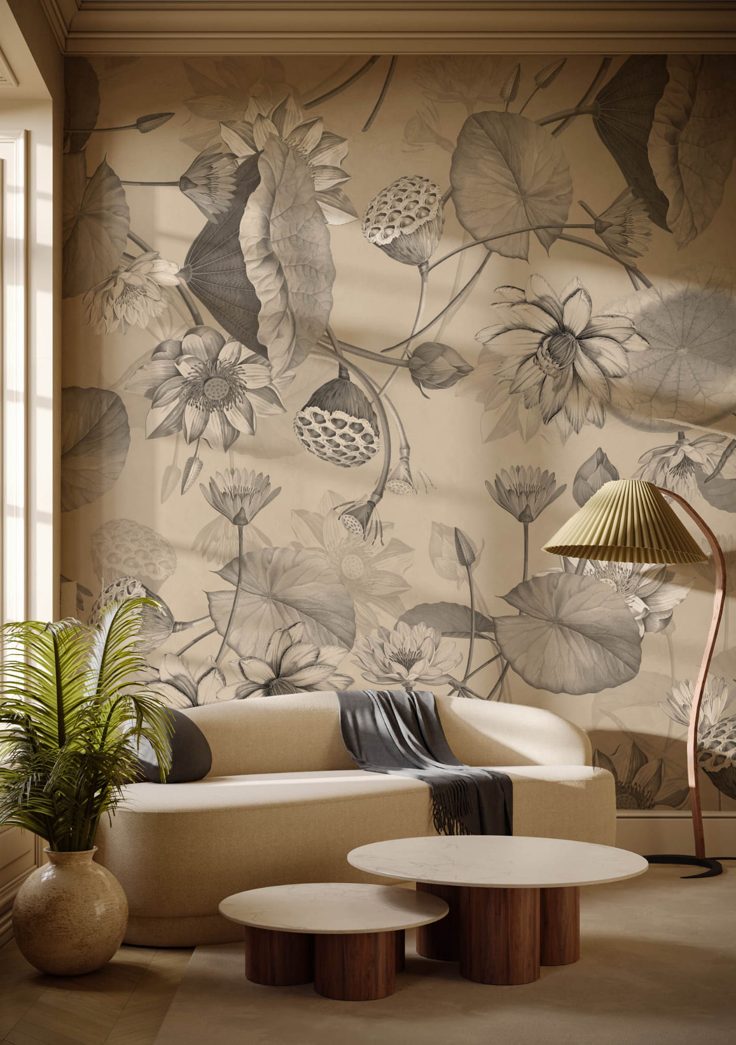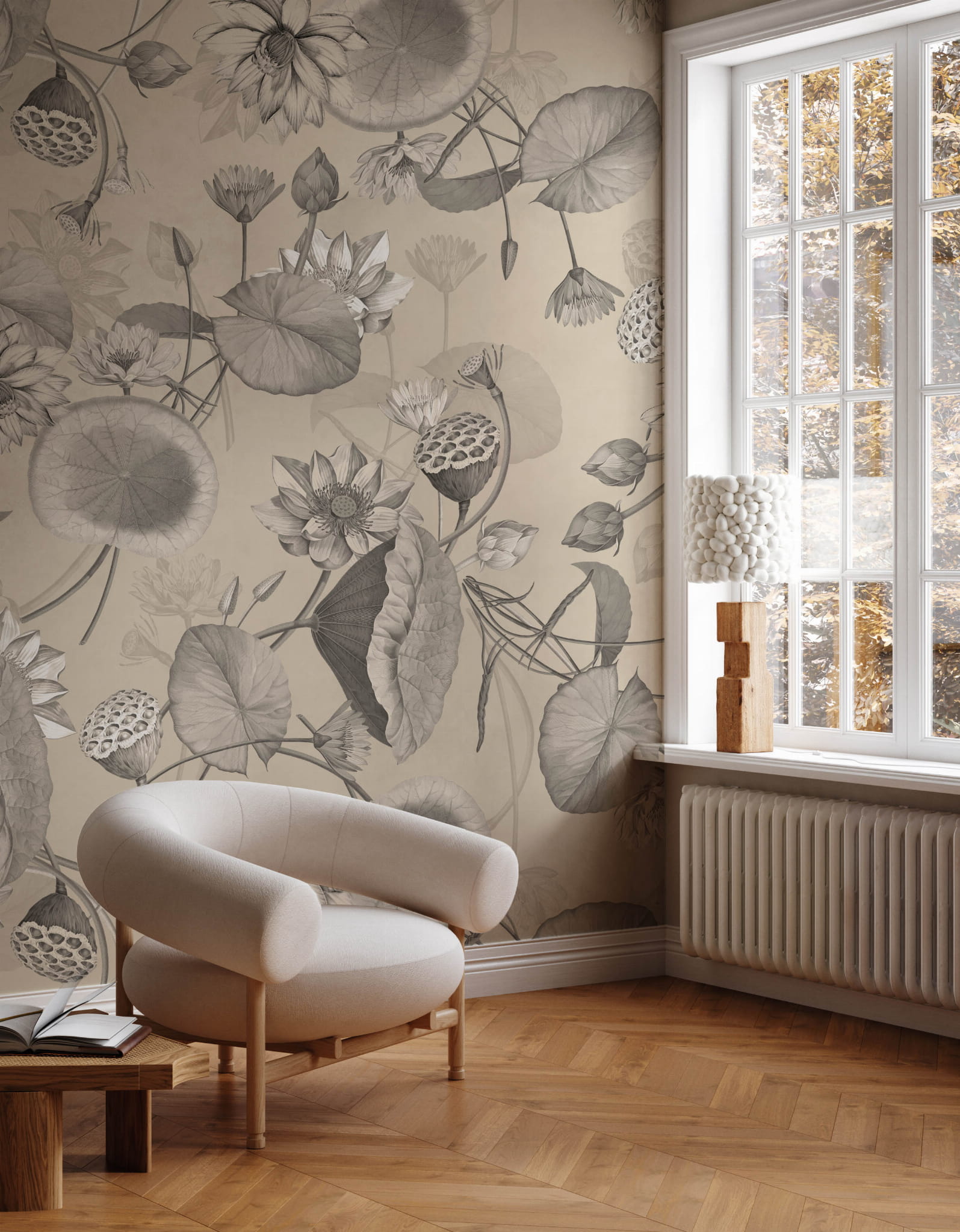 Subtelne odcienie szarości i beżu razem z delikatnym organicznym wzorem tworzą niepowtarzalną kombinację. Rozświetl swój pokój i rozłóż się pod kwiatami lotosu.