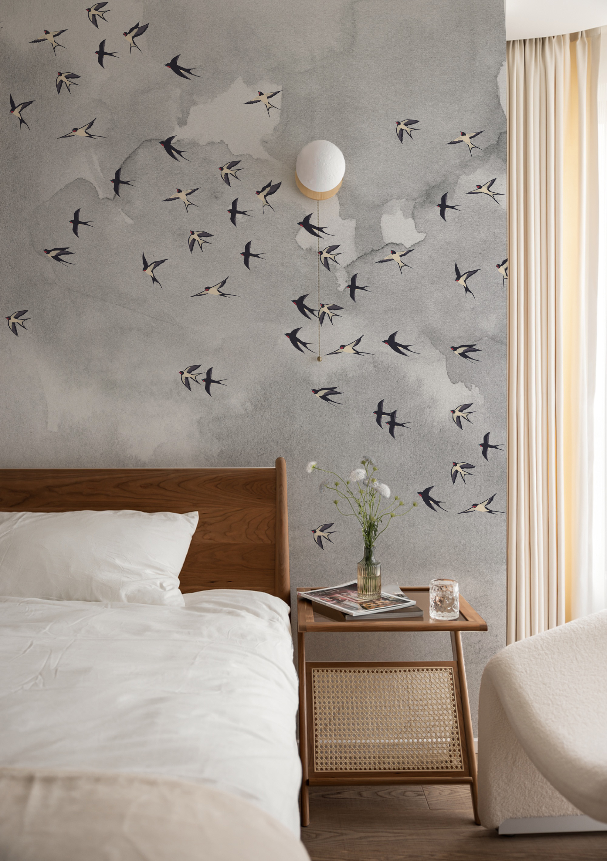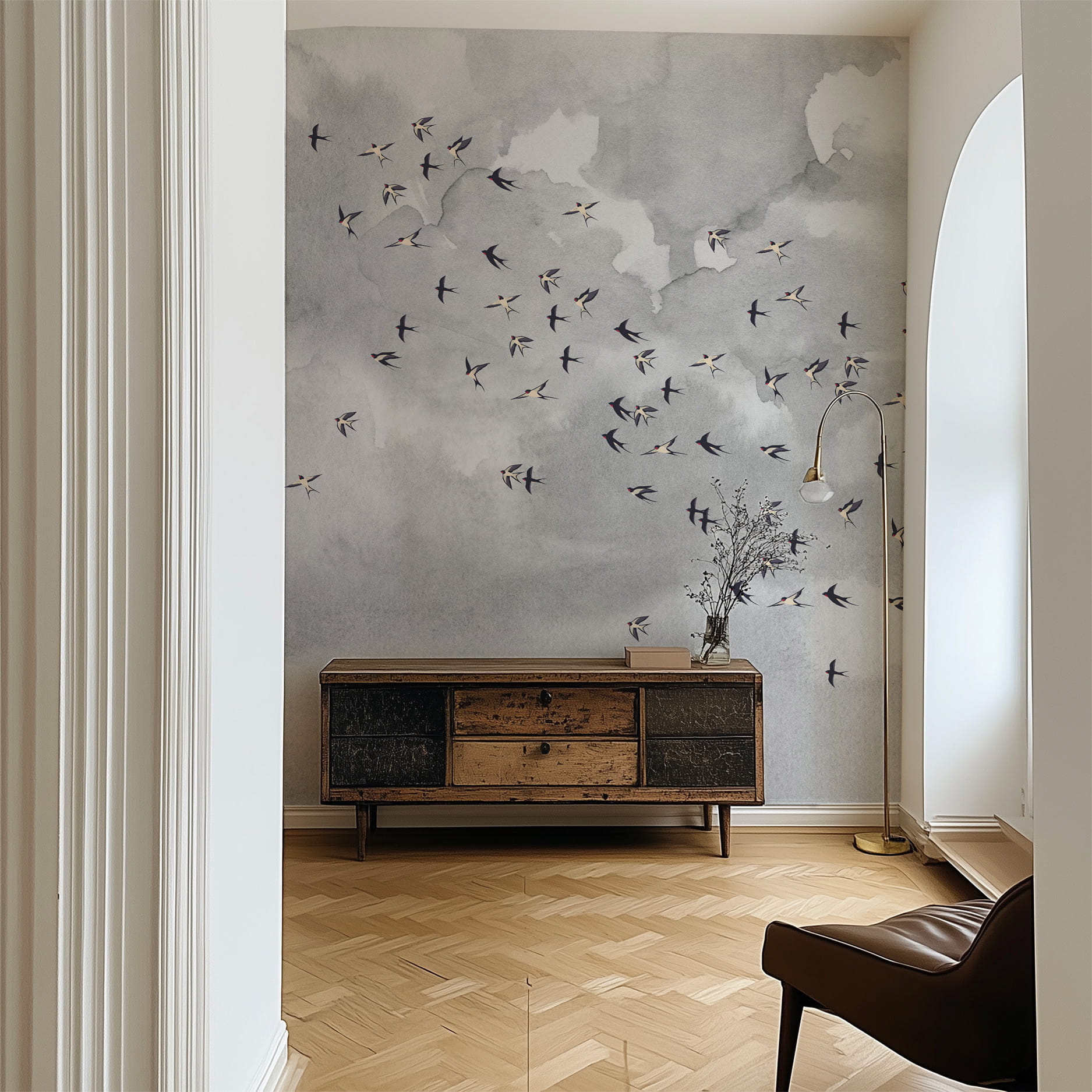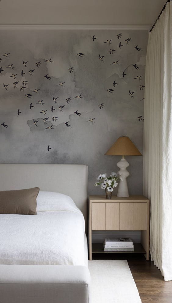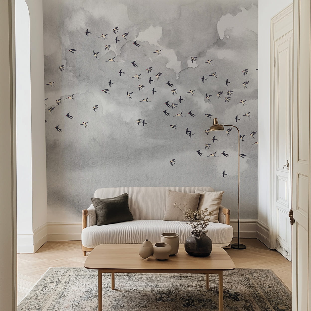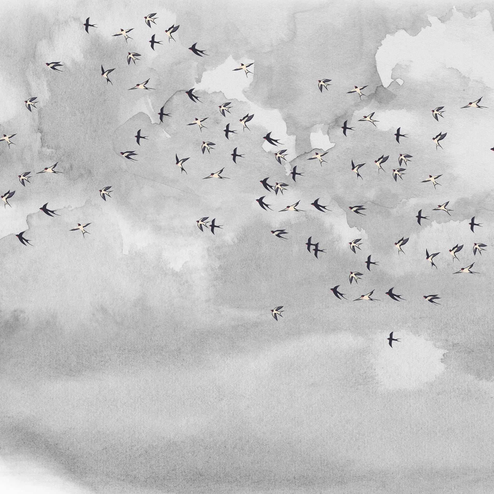 Daj się ponieść aż pod niebo i nadaj pokoju lekkości z naszą kultową tapetą w ptaki. Miękkie szare chmury nadadzą twoim ścianom faktury a delikatny wzór w ptaki doda pomieszczeniu życia.