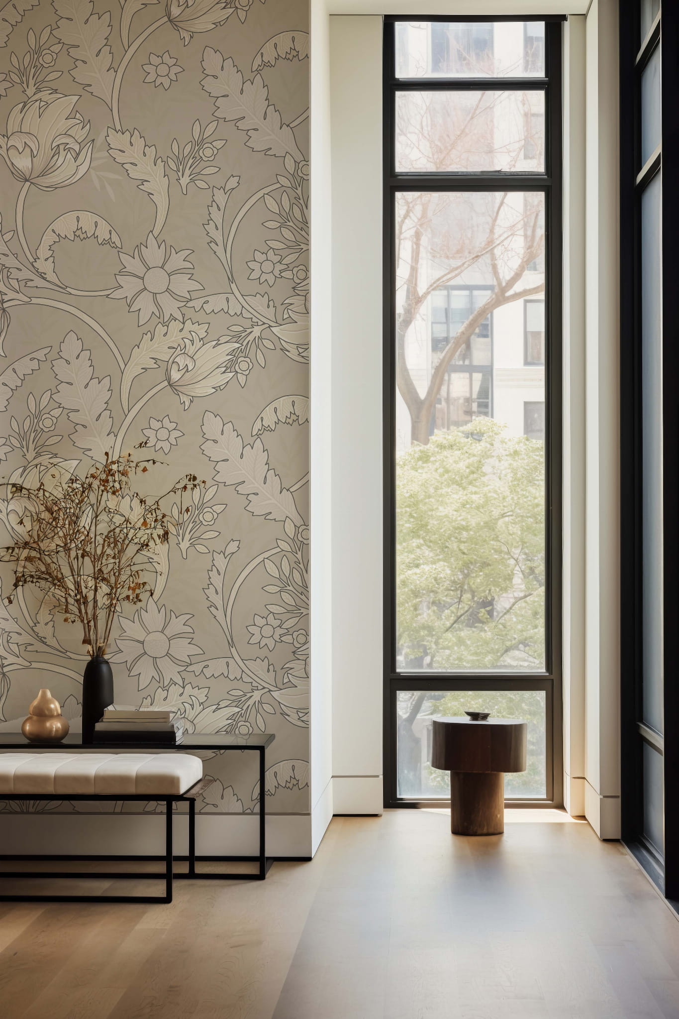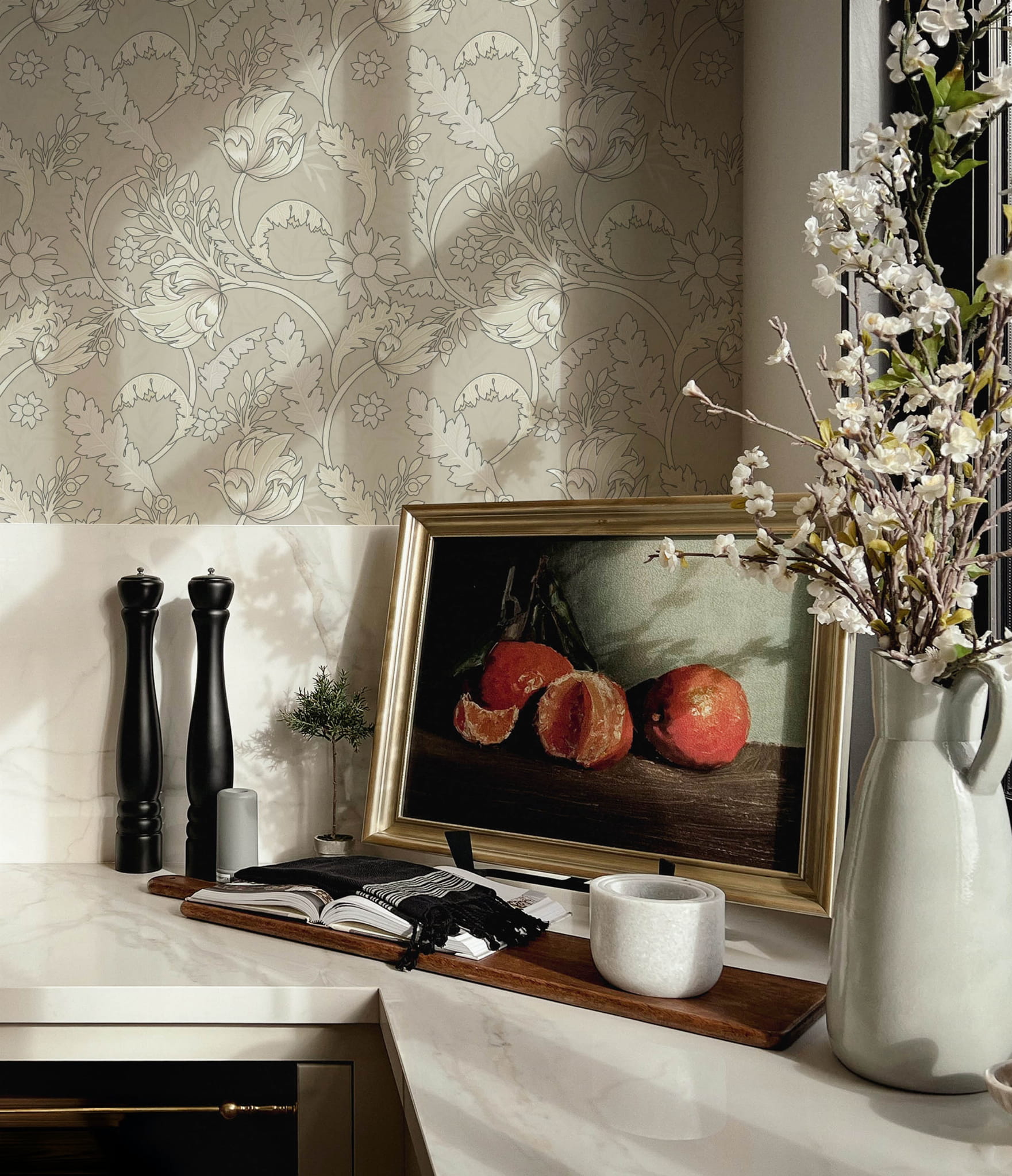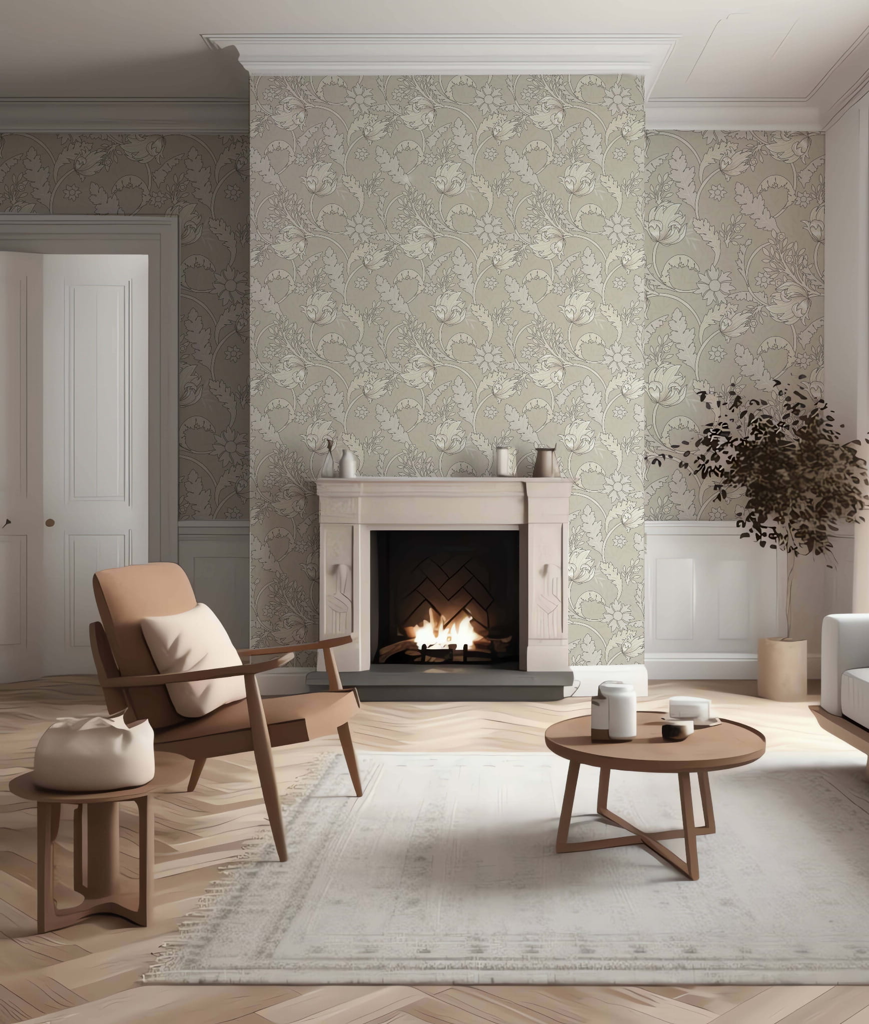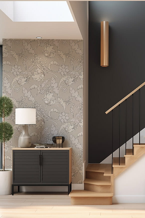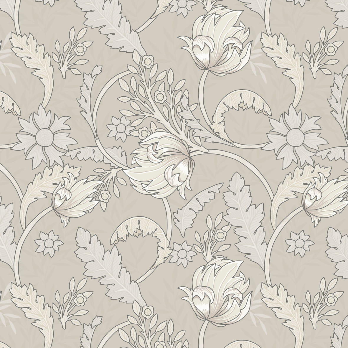 Klasyczny wzór w stylu William Morris w beżowych tonacjach, sprawdzi się w wielu wnętrzach nadając im elegancji. Ten wzór to idealny wybór oferujący ponadczasowy design.