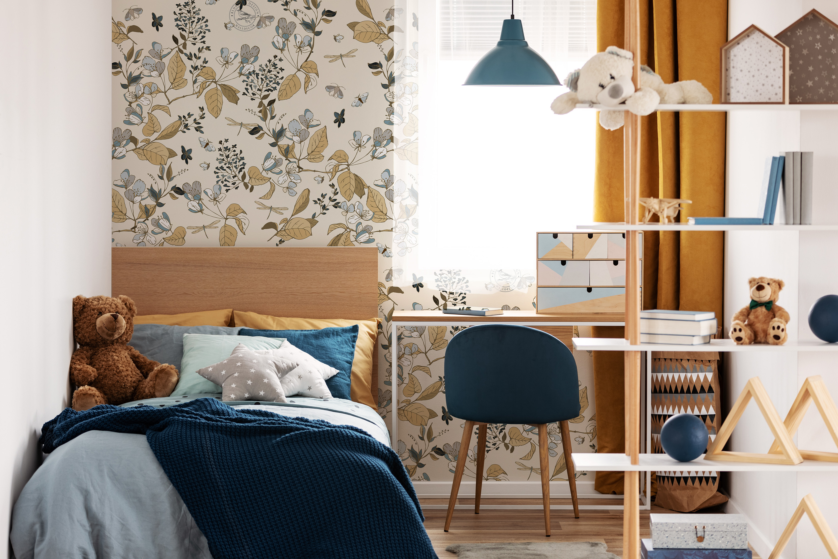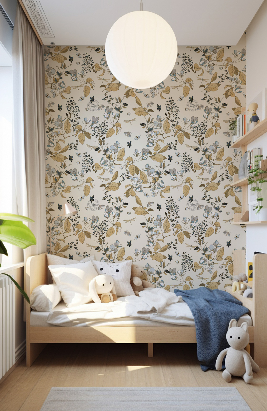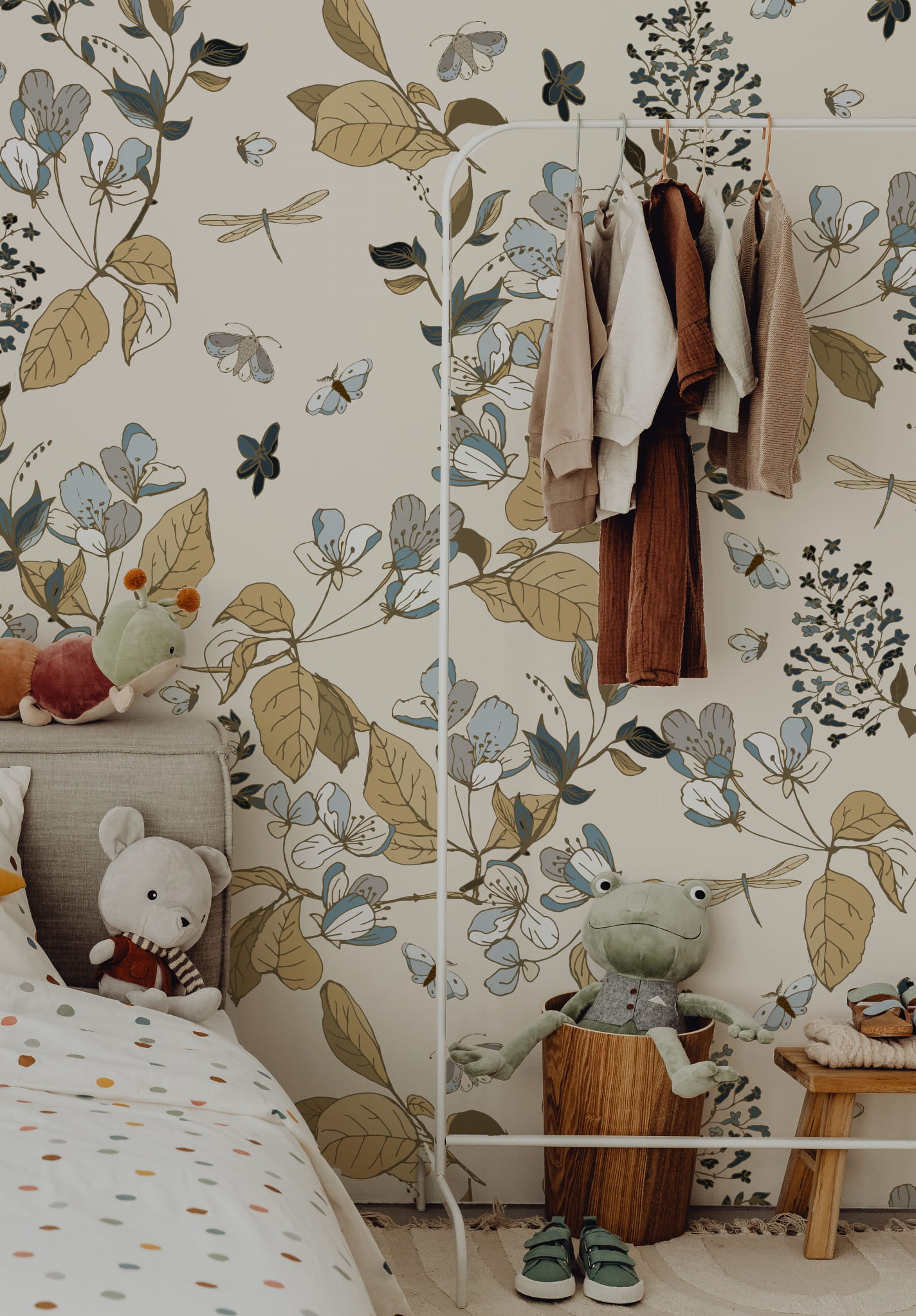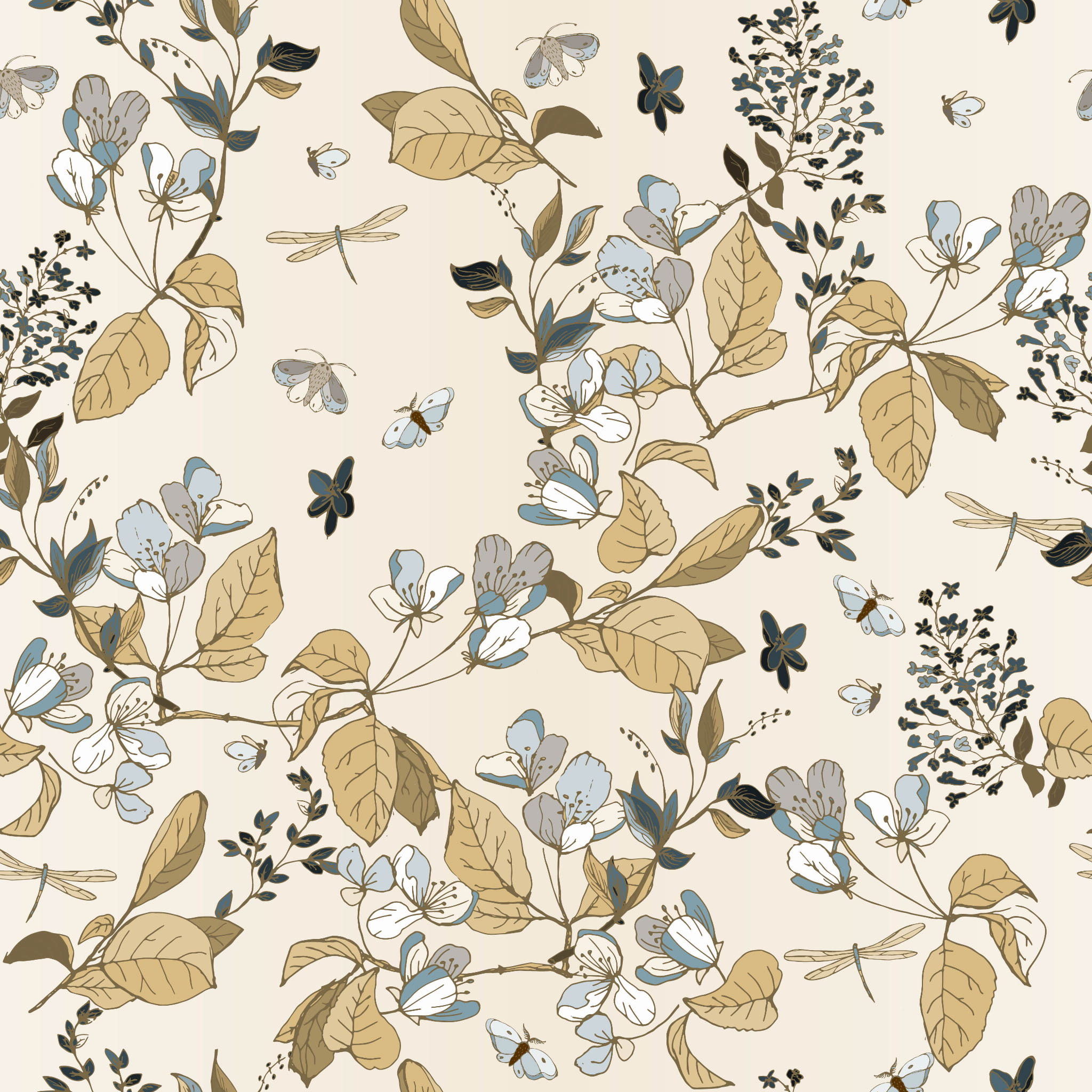Subtelny beż, który jest tłem tapety idealnie kontrastuje z niebieskimi elementami natury widniejącymi na tapecie. Motyle jak i ważki będące w ruchu ożywiają wzór. Ta tapeta z pewnością nie znudzi się z biegiem lat.